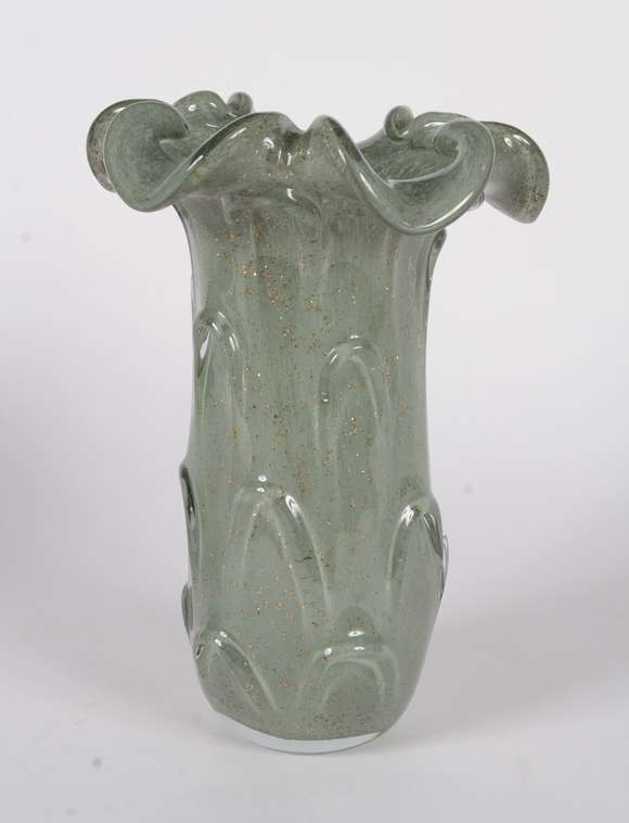 Vaso de vidro decorativo na cor verde com relevos, borda trabalhada com pó de ouro.