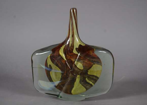 Vaso de vidro Mdina Glass, forma de "cabeça de machado", assinado e datado 1979. Fabricado na Ilha de Malta, mar medi...
