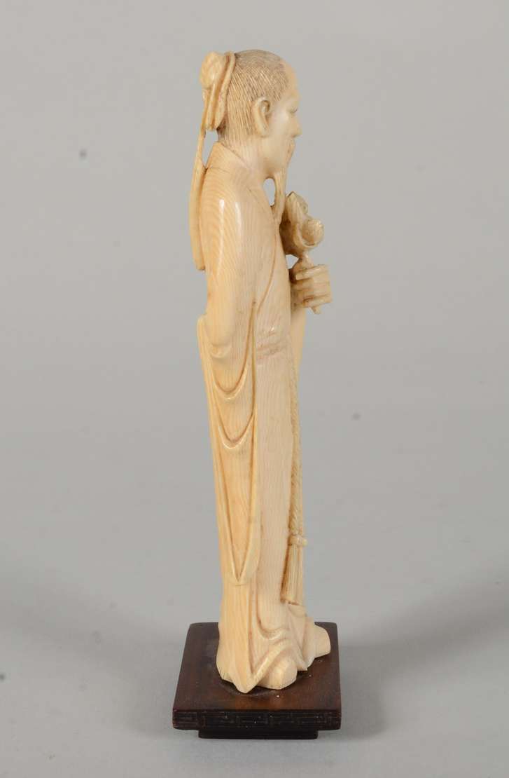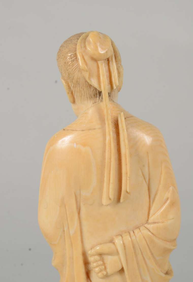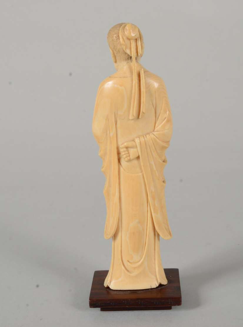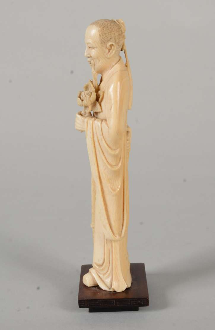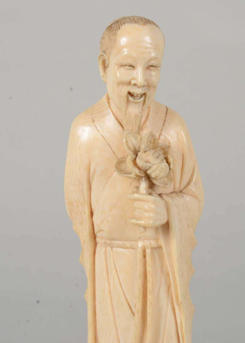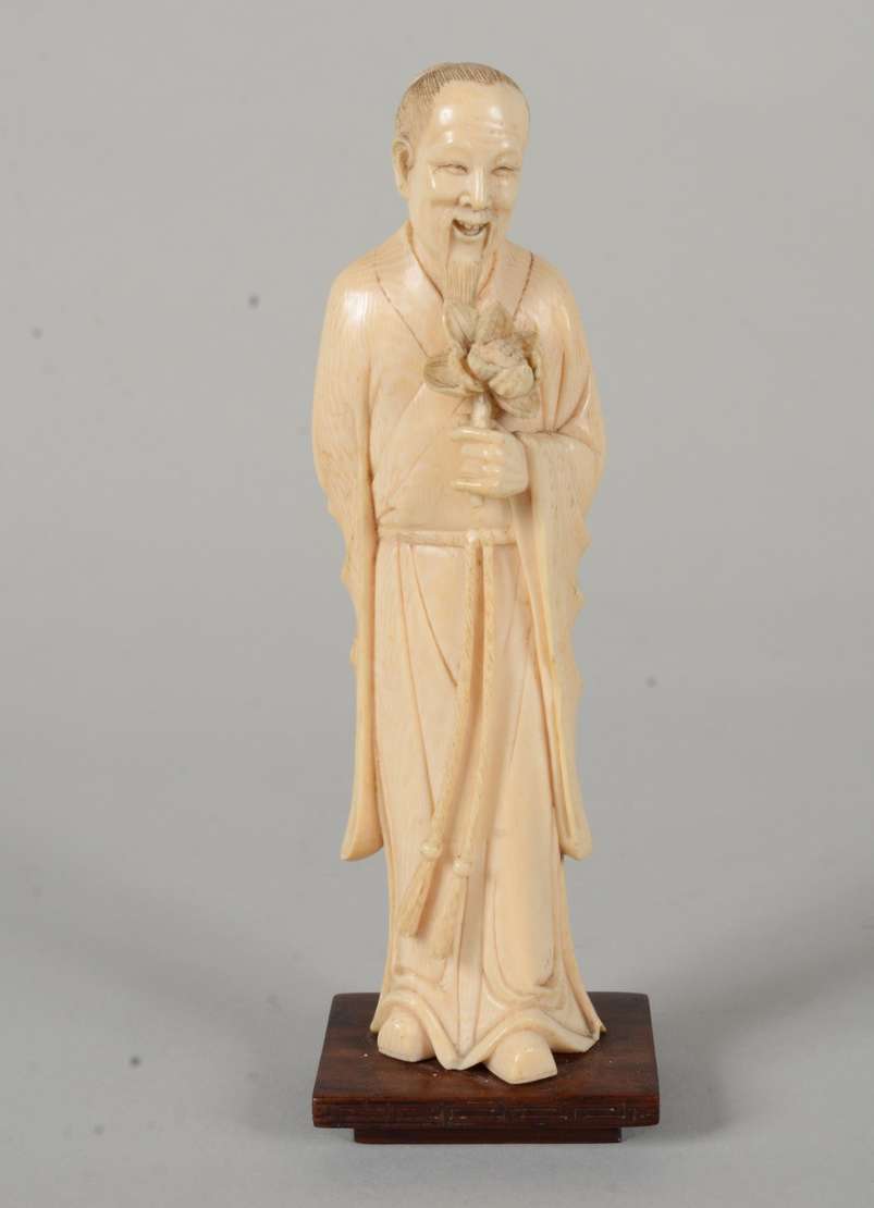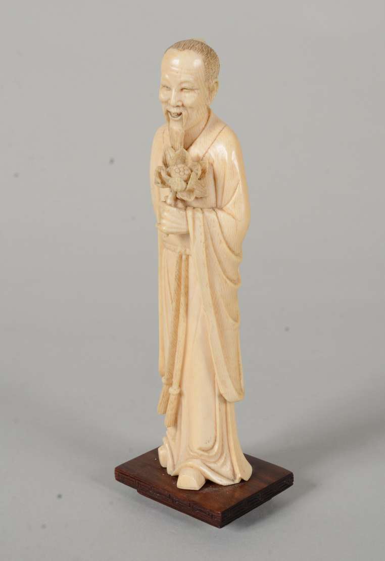 Escultura representando sábio de lacca oriental, base de madeira. Mãos soltas e com pequenos defeitos.