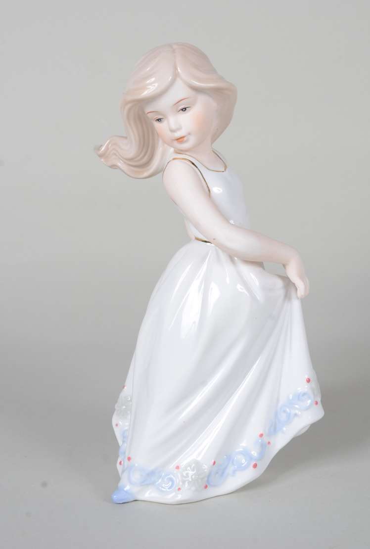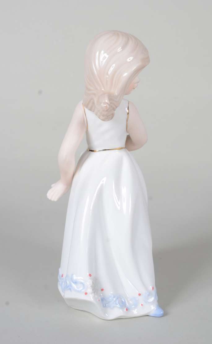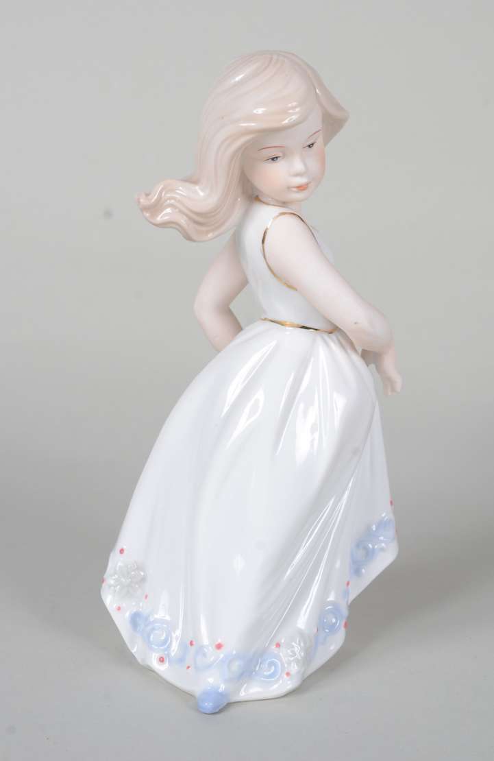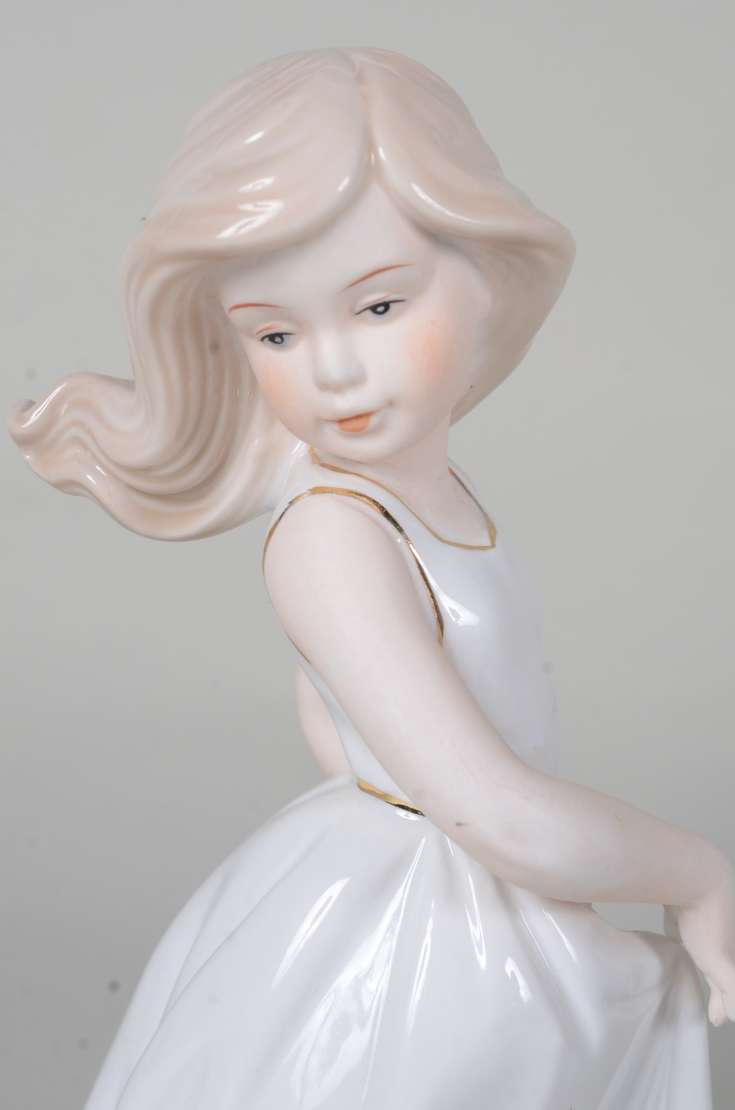 Estatueta de cerâmica policromada representando ninfa com flauta sobre cavalo, assinada.