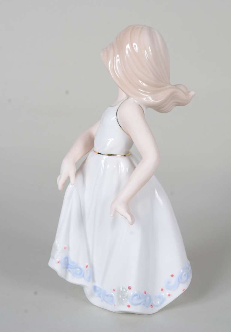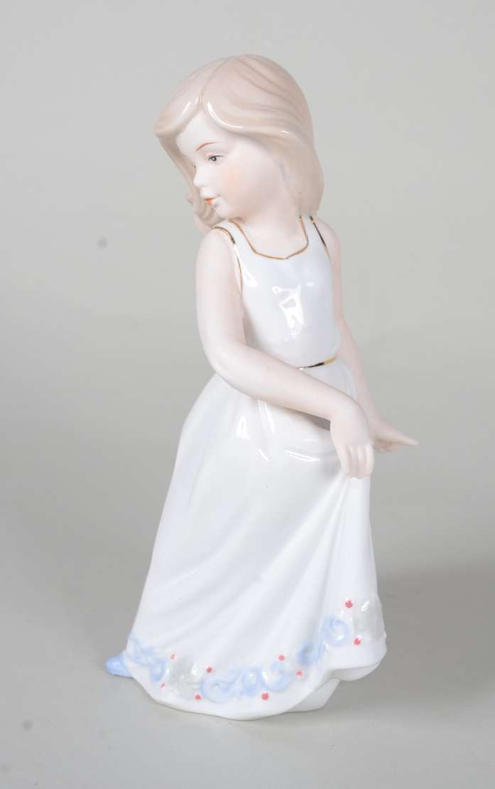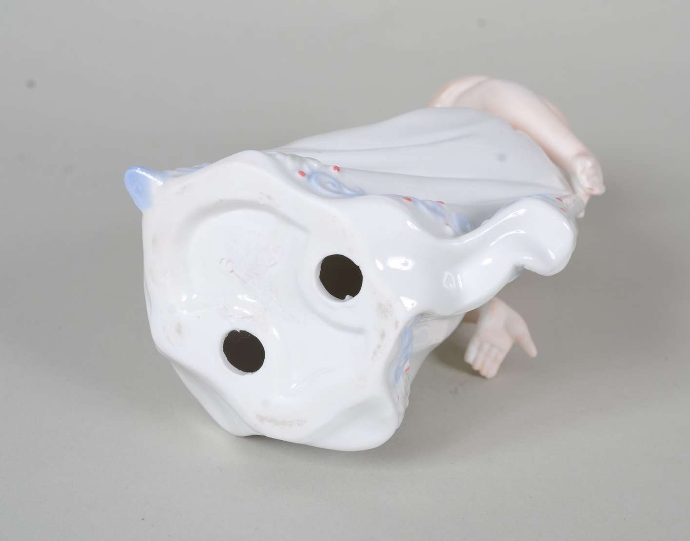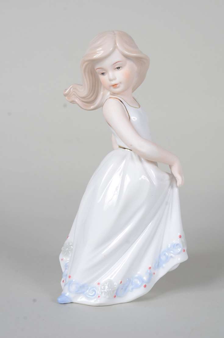 Estatueta de cerâmica policromada representando ninfa com flauta sobre cavalo, assinada.