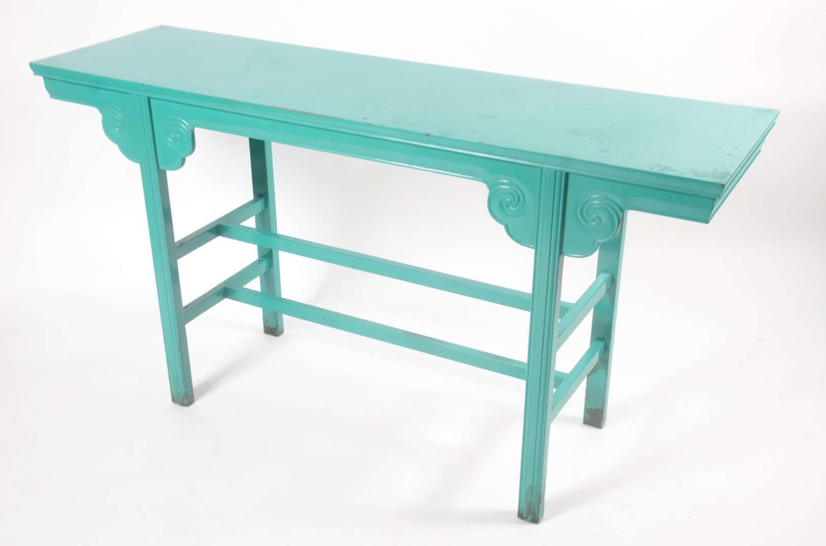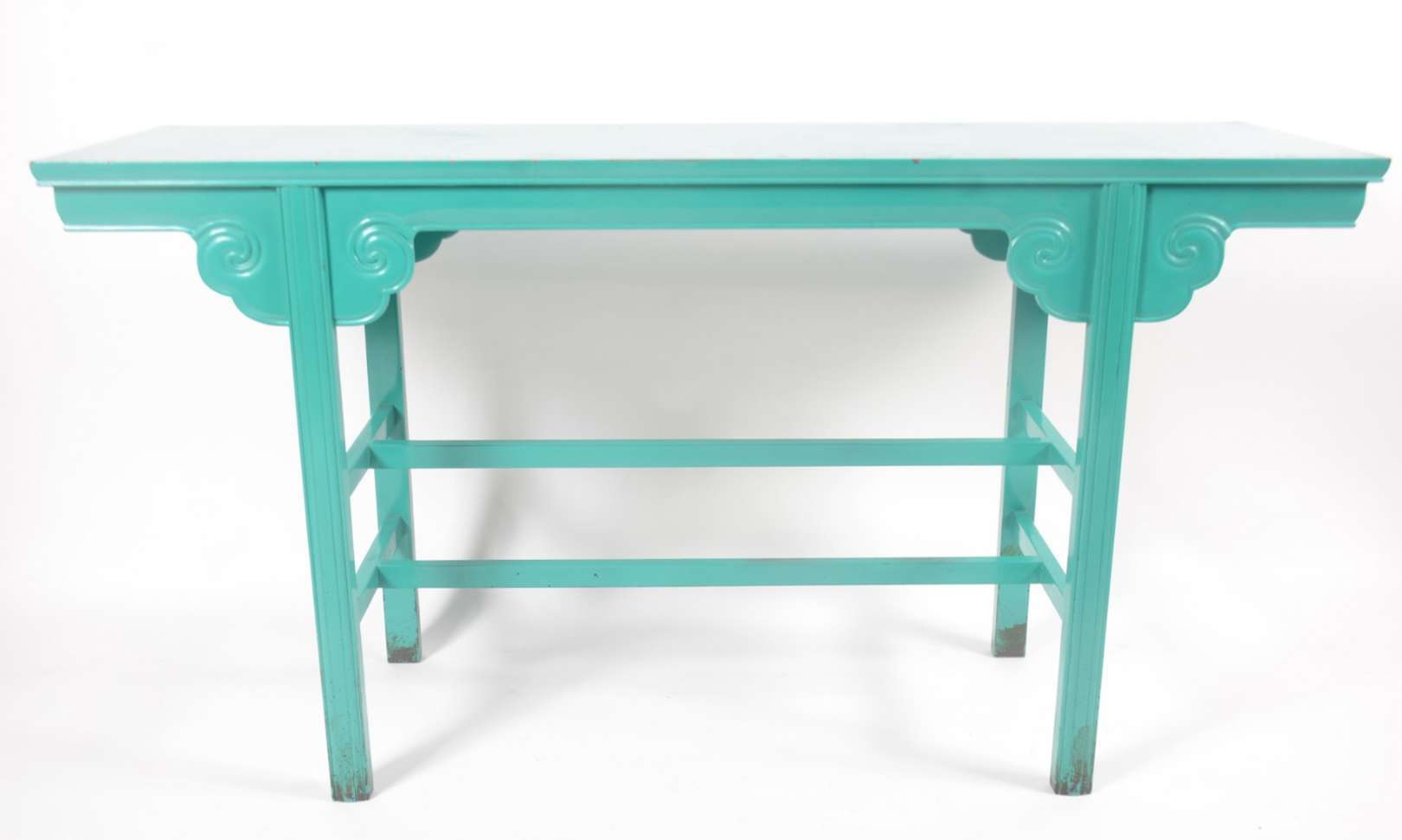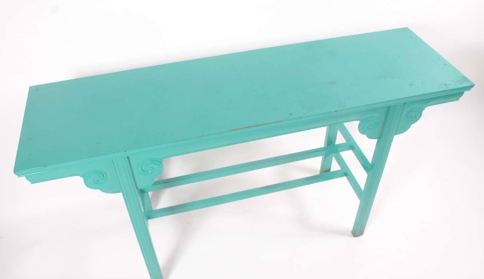 Mesa alta de madeira nobre, tampo retangular apoiado em pernas torneadas ligadas por traves inferiores. Estilo manoel...