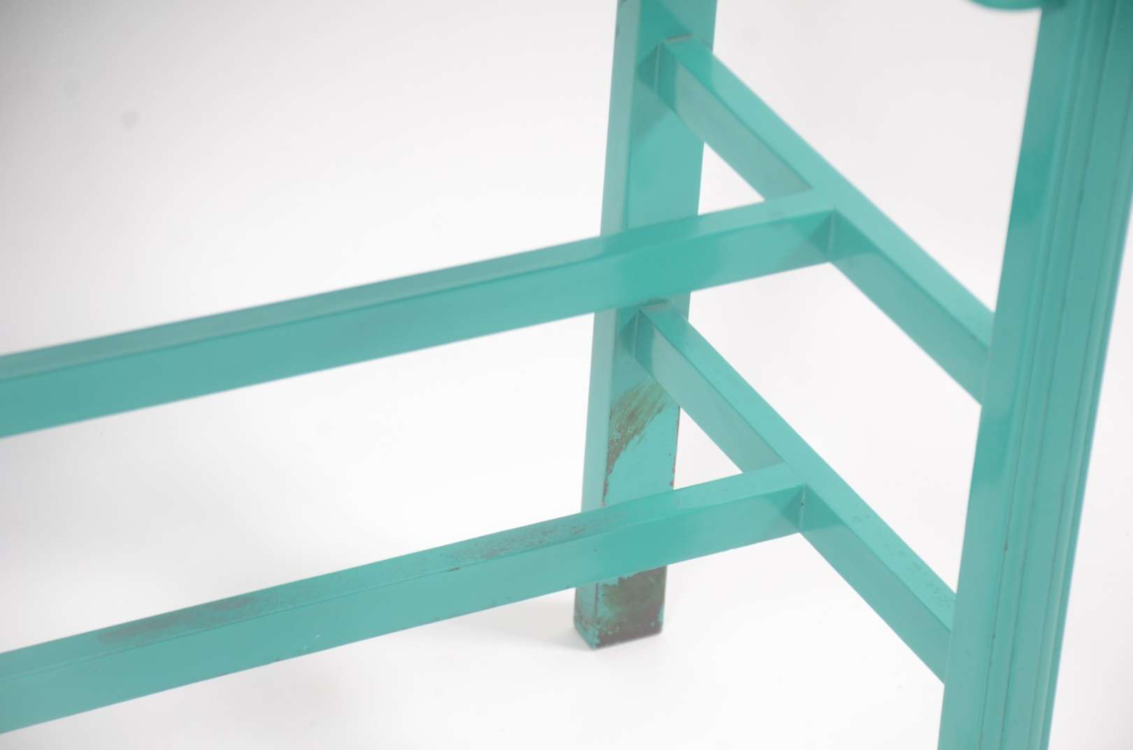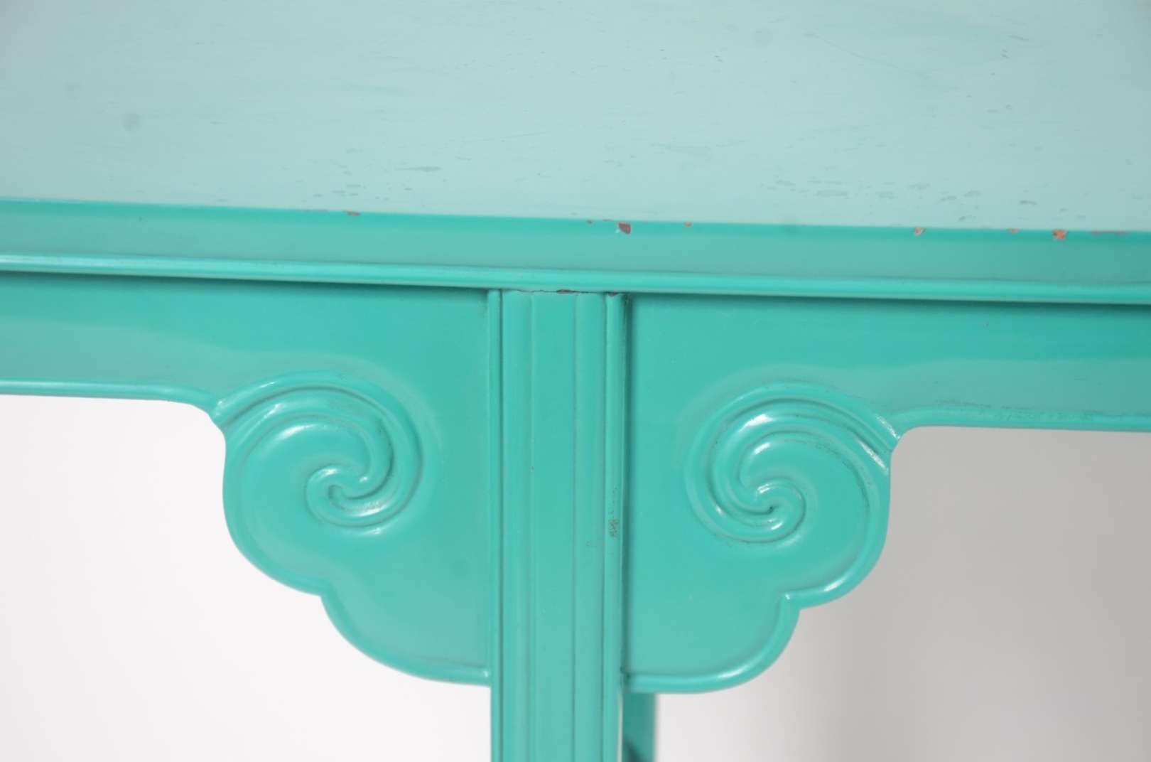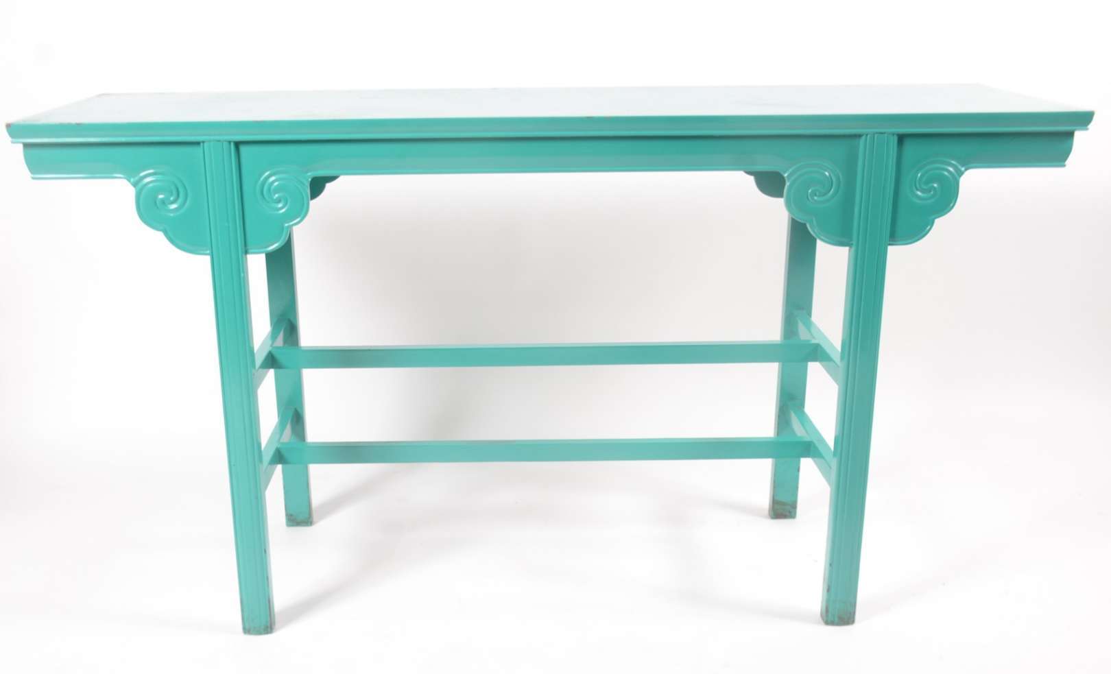 Mesa alta de madeira nobre, tampo retangular apoiado em pernas torneadas ligadas por traves inferiores. Estilo manoel...