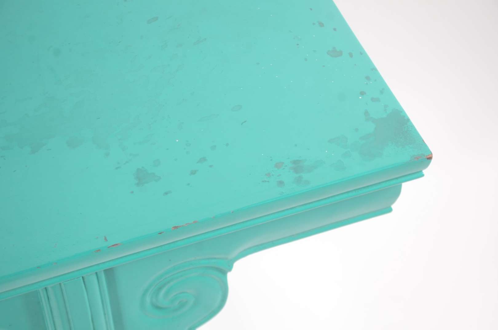 Mesa auxiliar de madeira nobre, tampo feitio retangular tendo 3 gavetas com detalhes "em leques" e puxadores de metal...