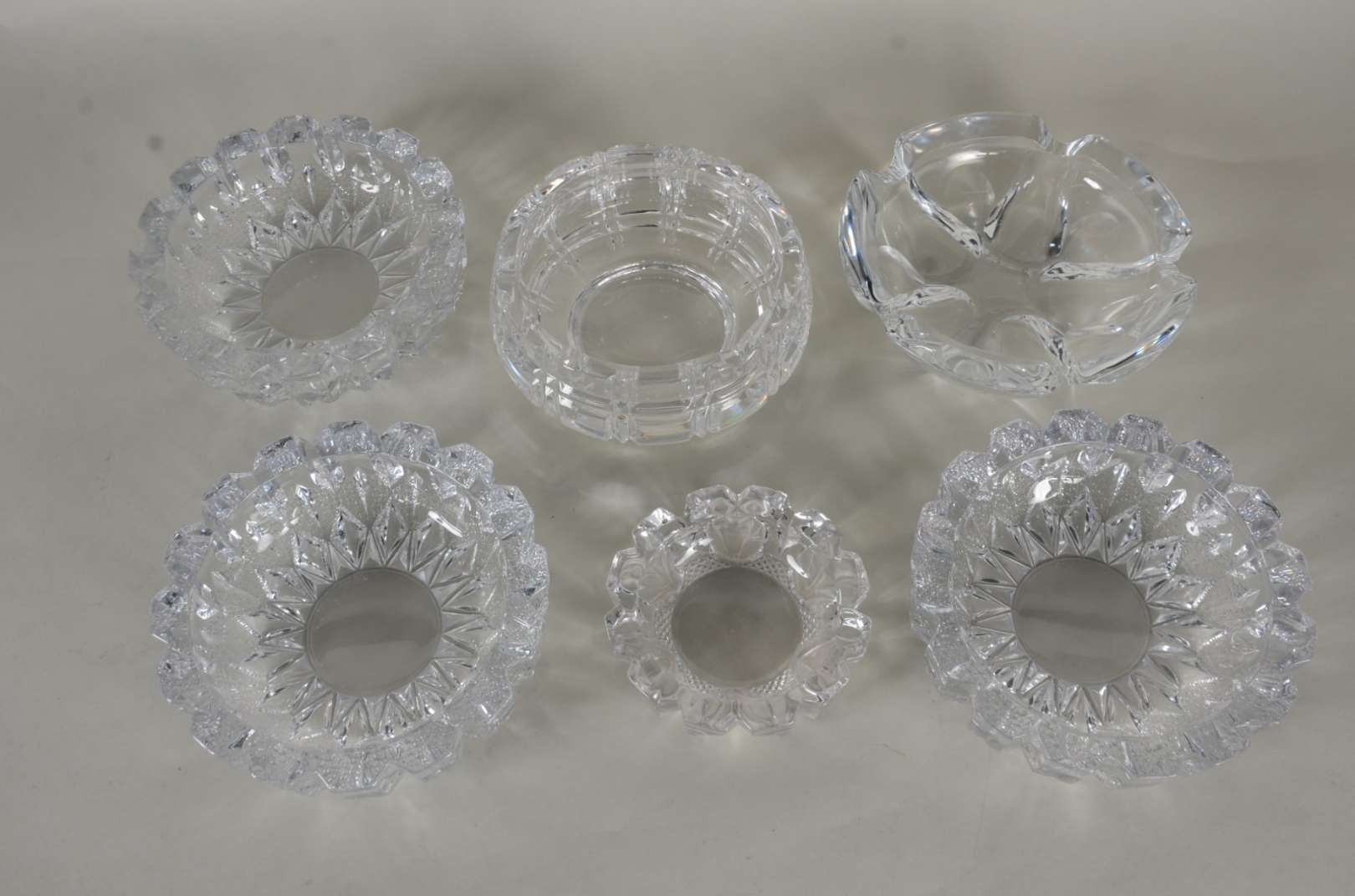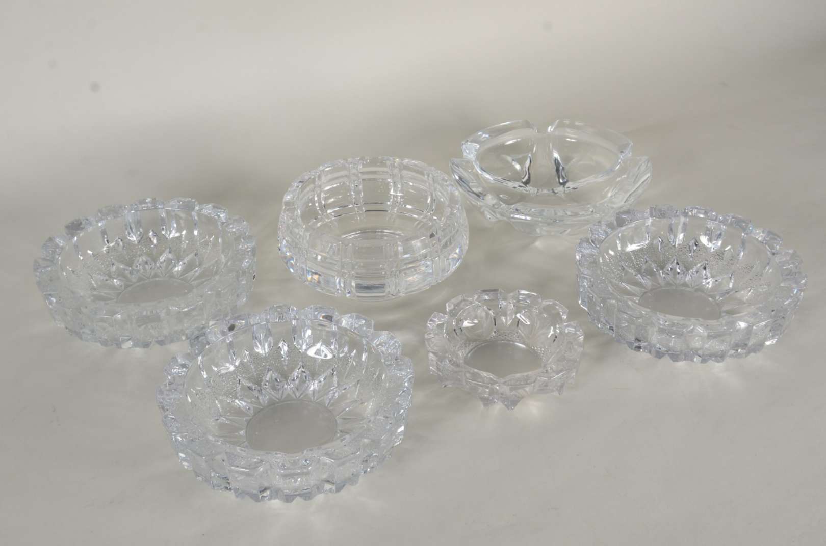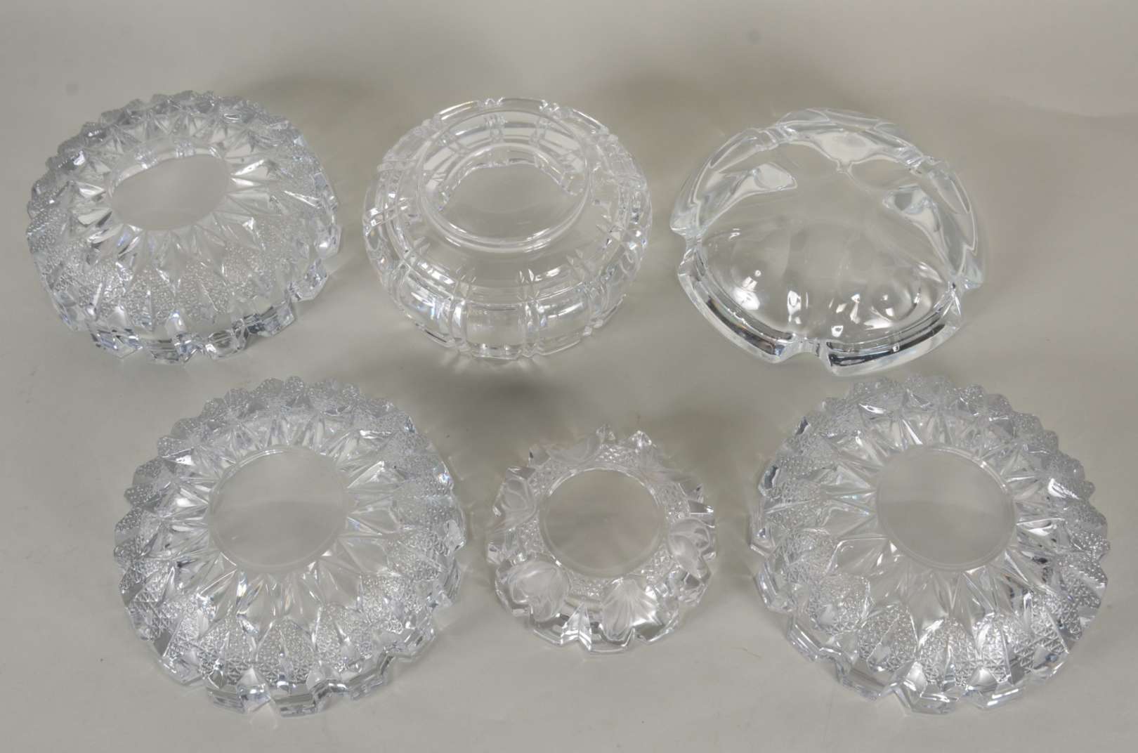 Seis frascos de cristal com tampas de prata com inicias J.H. (um frasco com borda quebrada). Peso das tampas de prata...