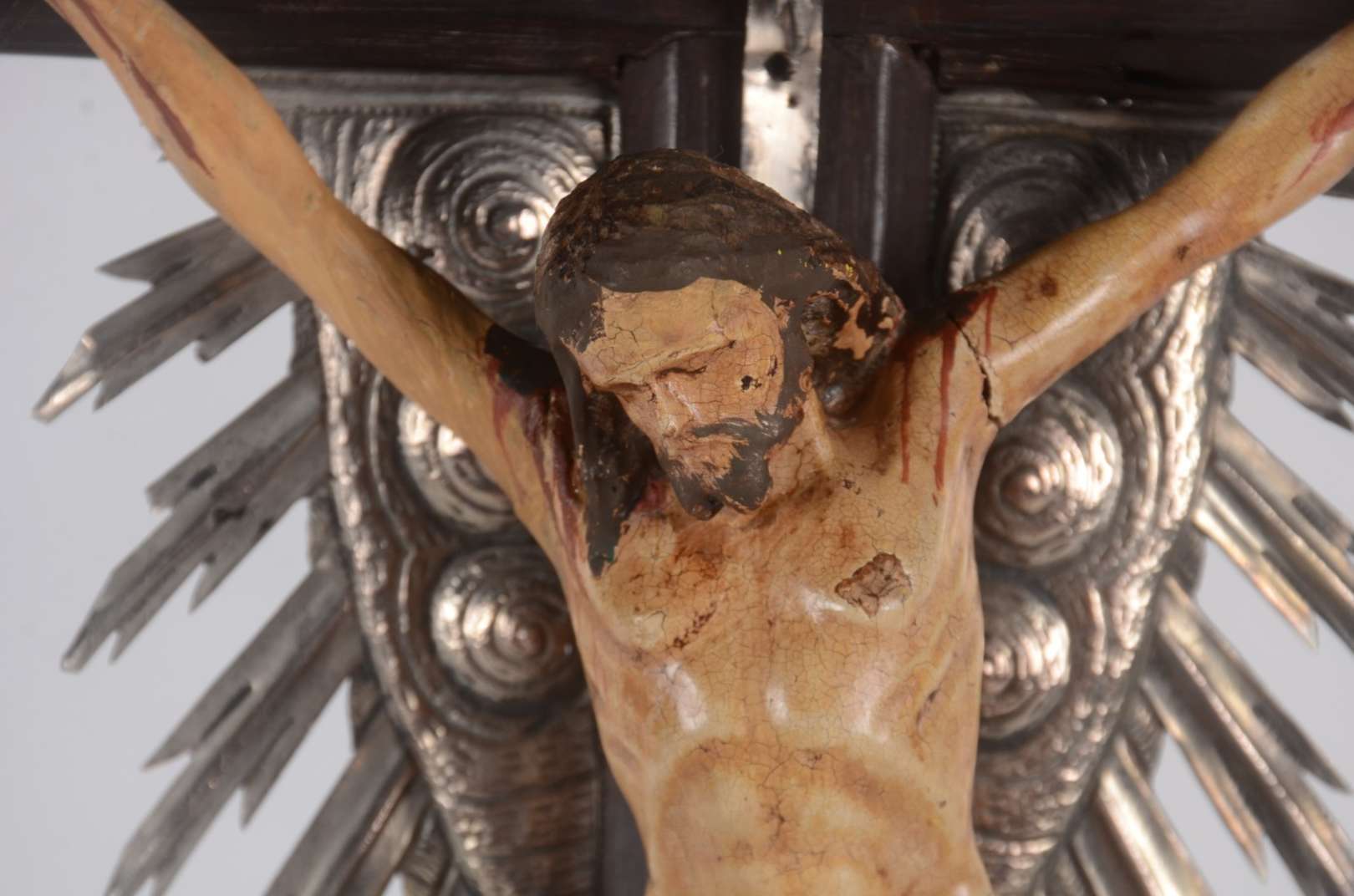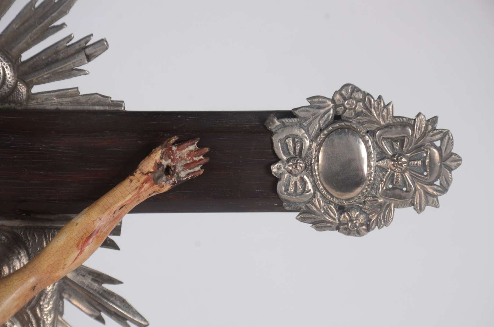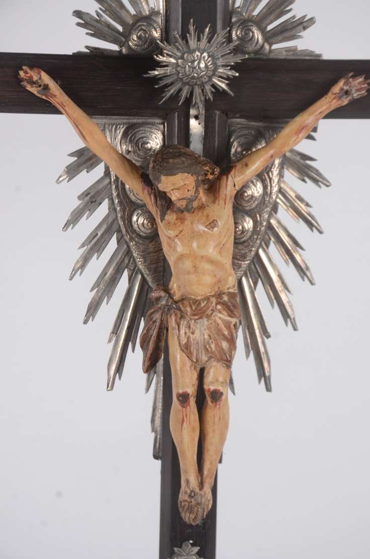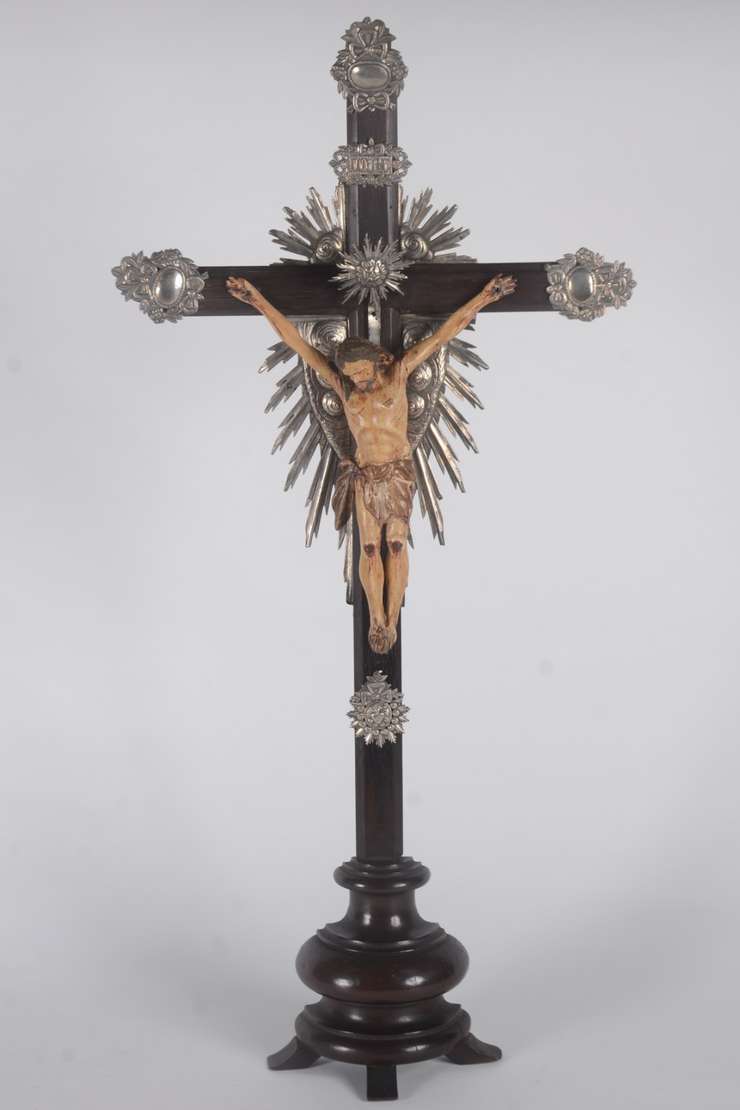 Crucifixo de madeira entalhada com figura de Cristo de marfim ricamente esculpida.