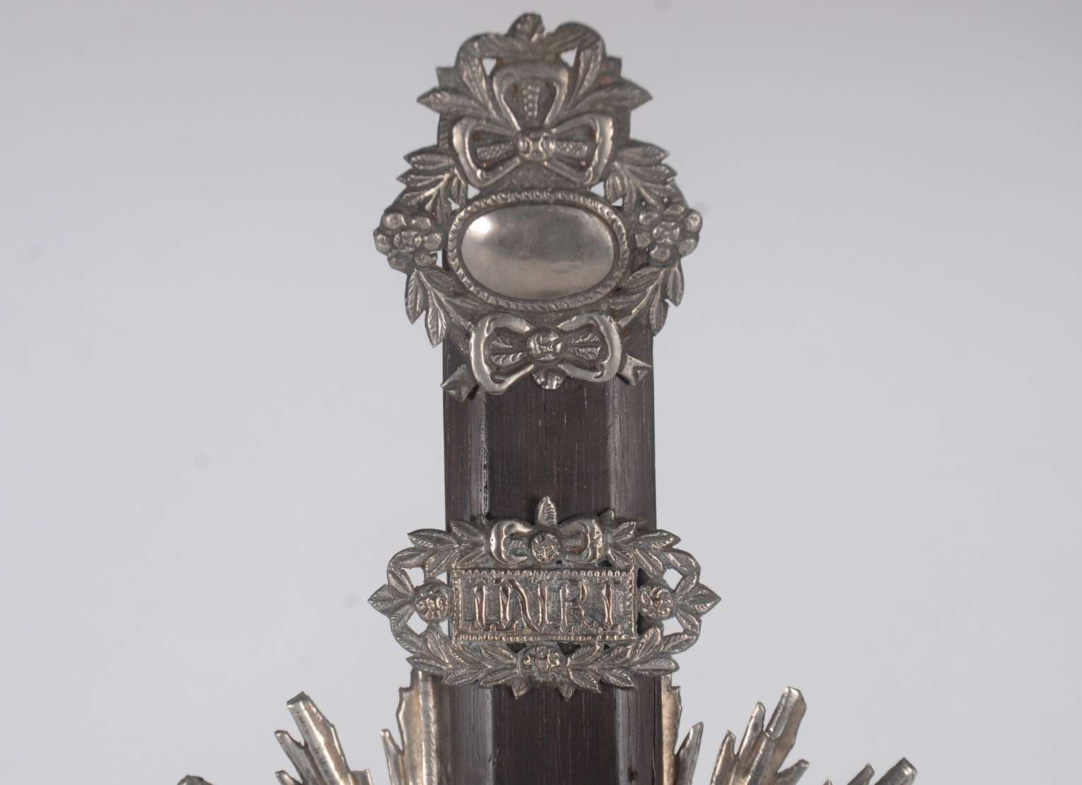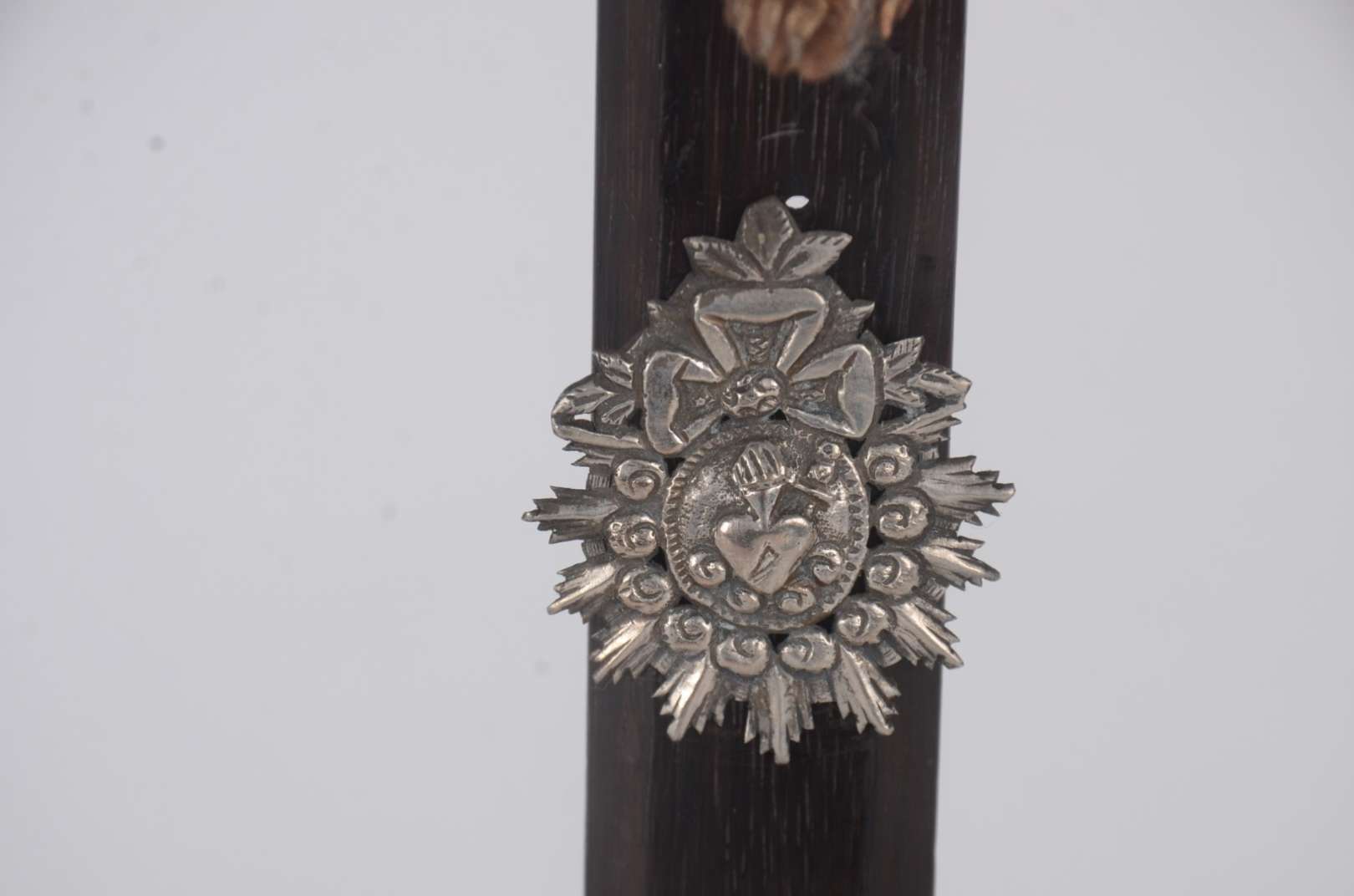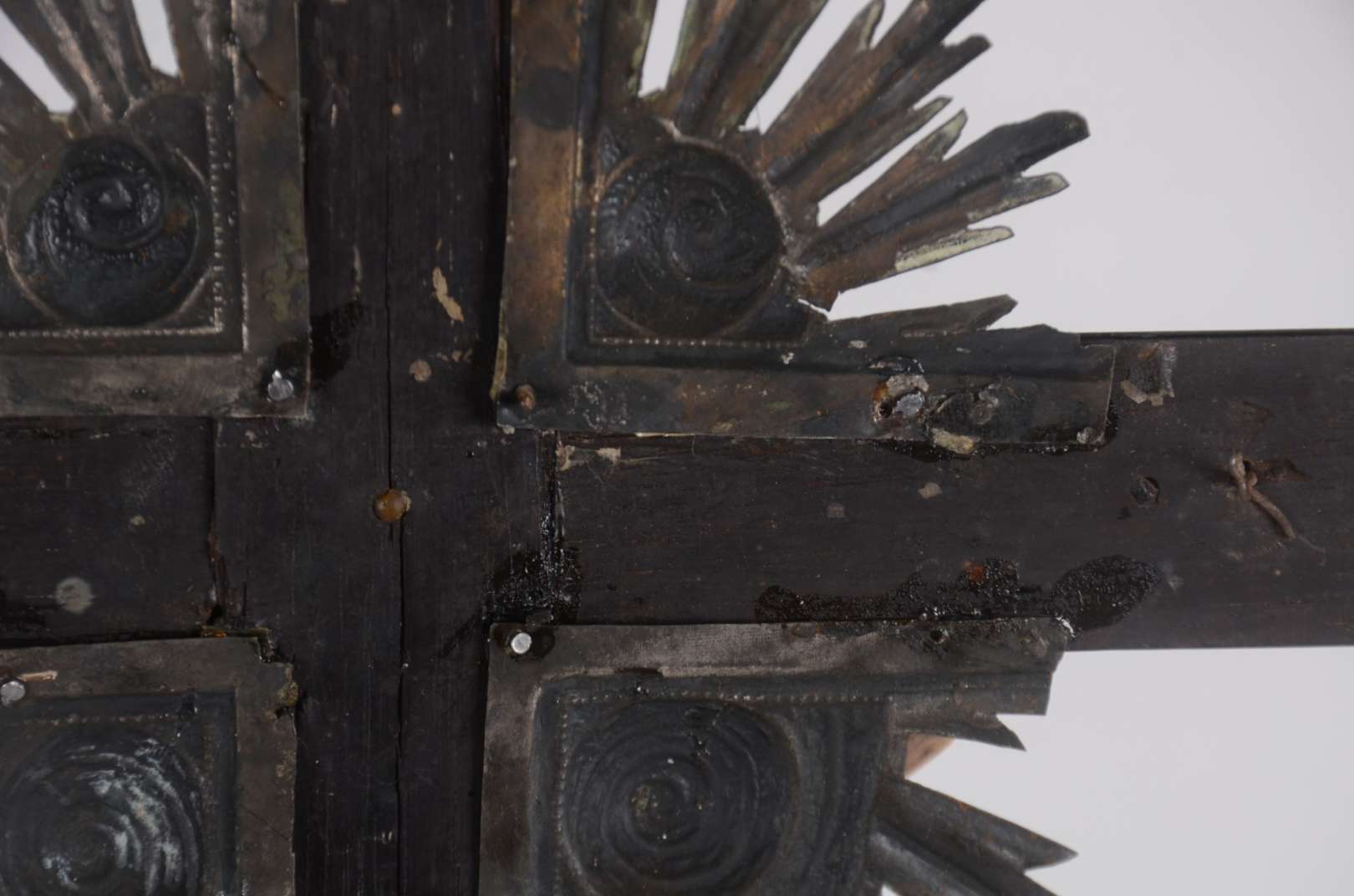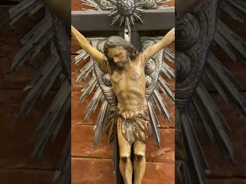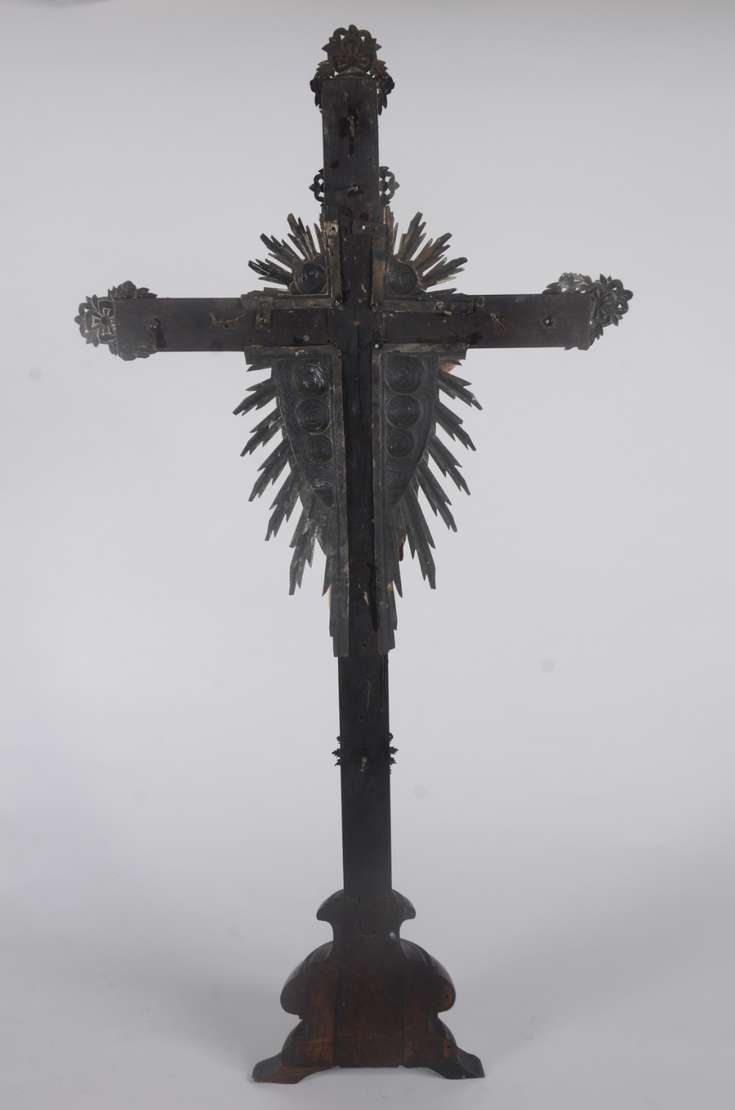 Crucifixo de madeira entalhada com figura de Cristo de marfim ricamente esculpida.