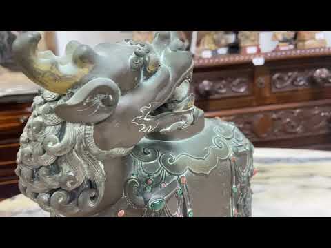 Par de estatuetas orientais de faiança craquelê na cor amarela e metal. (uma delas com o pé da base quebrado).
