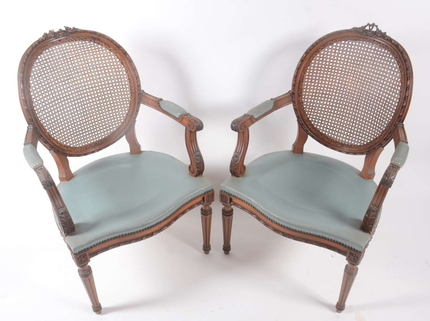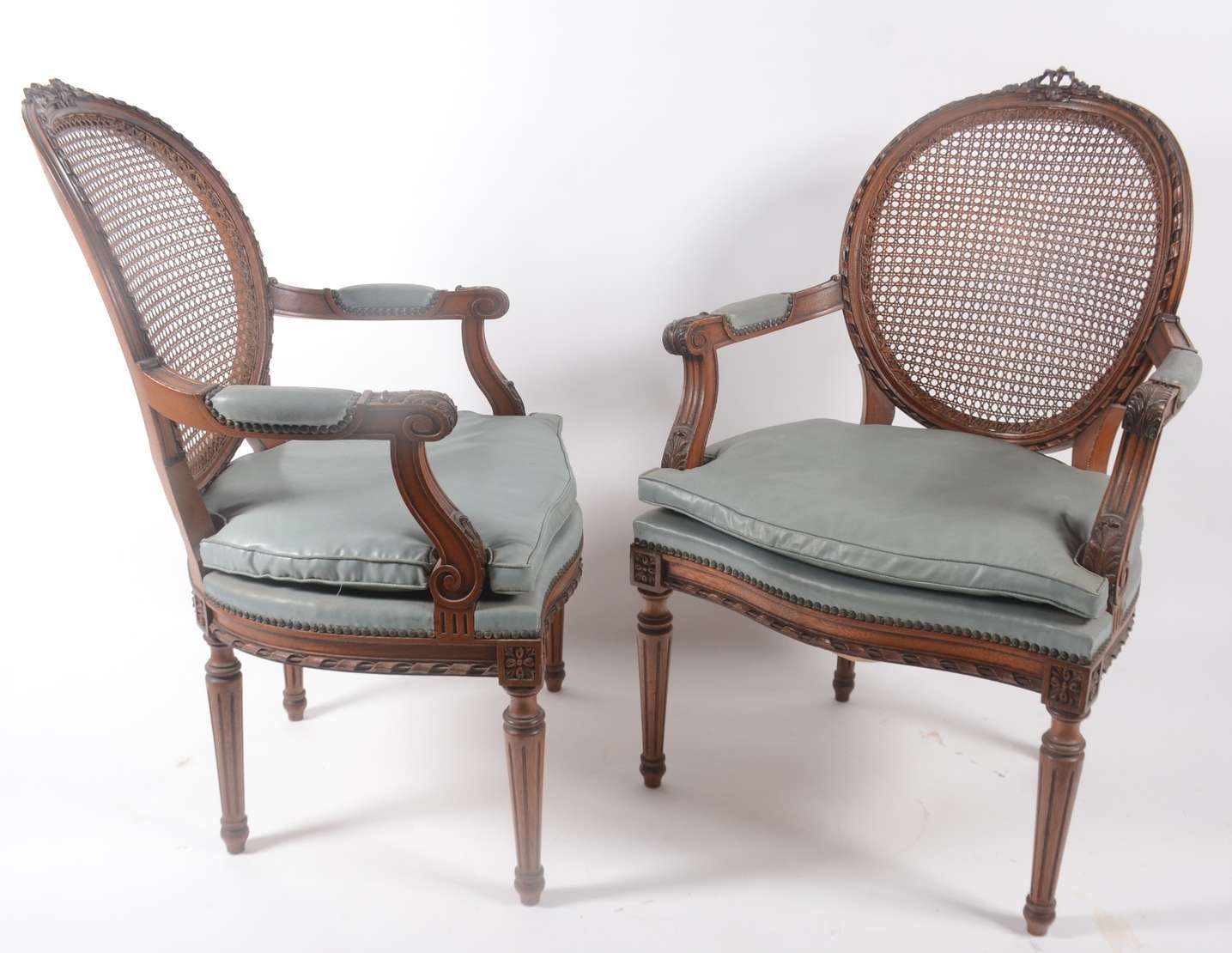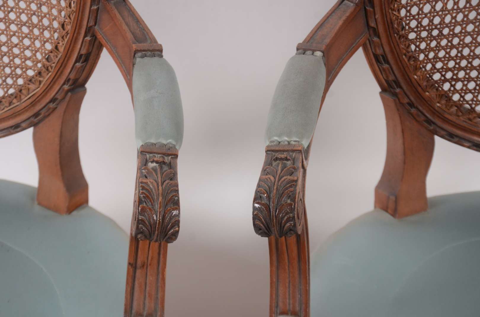 Duas cadeiras com braços de madeira nobre, assentos estofados e forrados com tecido listrado, pernas frontais torneadas.