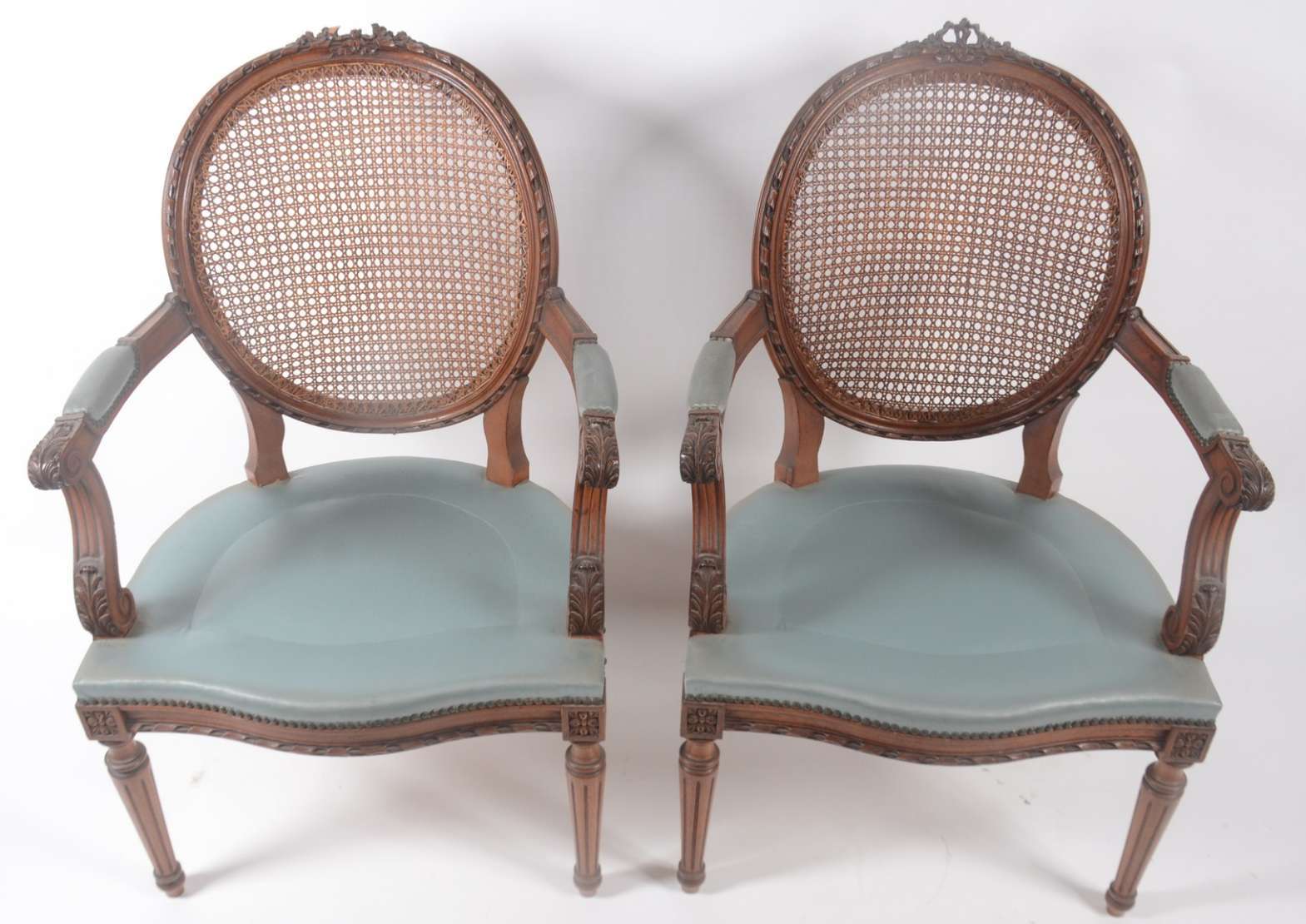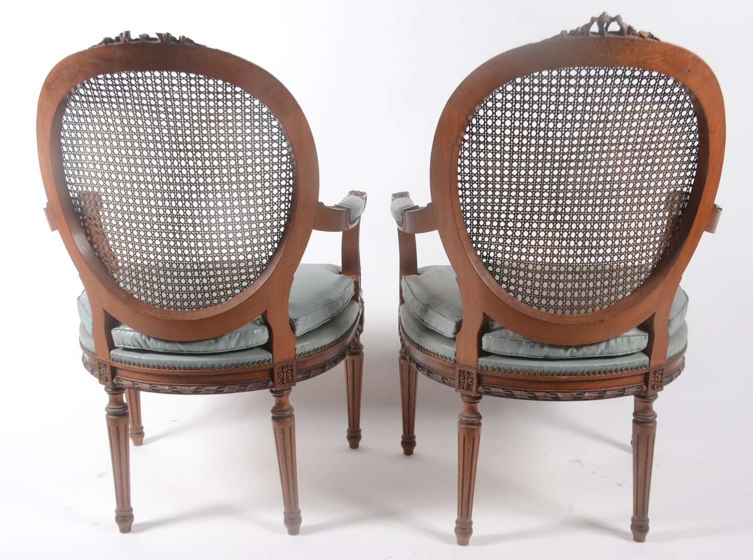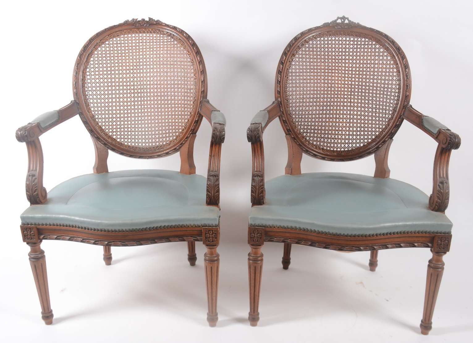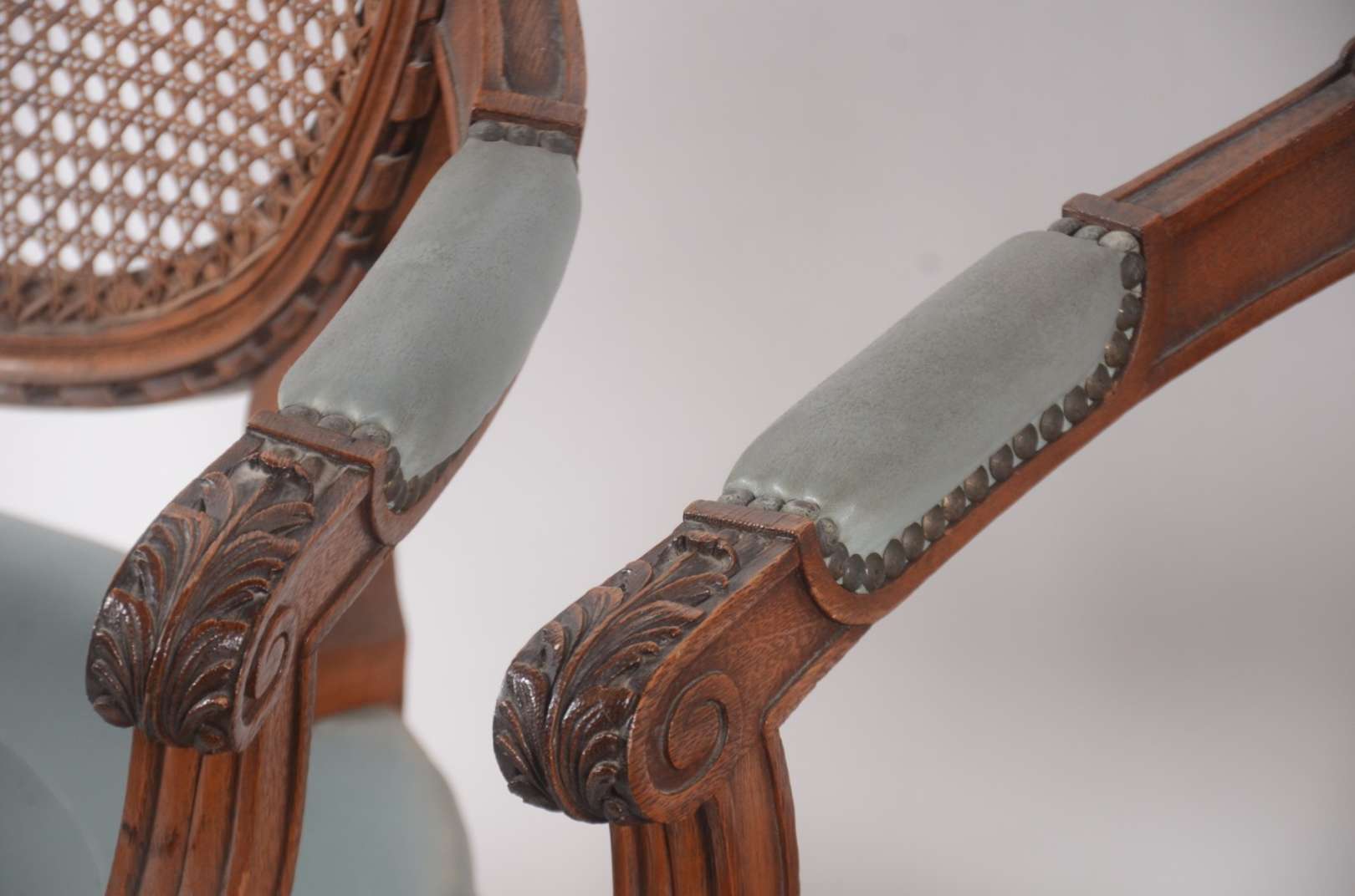 Duas cadeiras com braços de madeira nobre, assentos estofados e forrados com tecido listrado, pernas frontais torneadas.