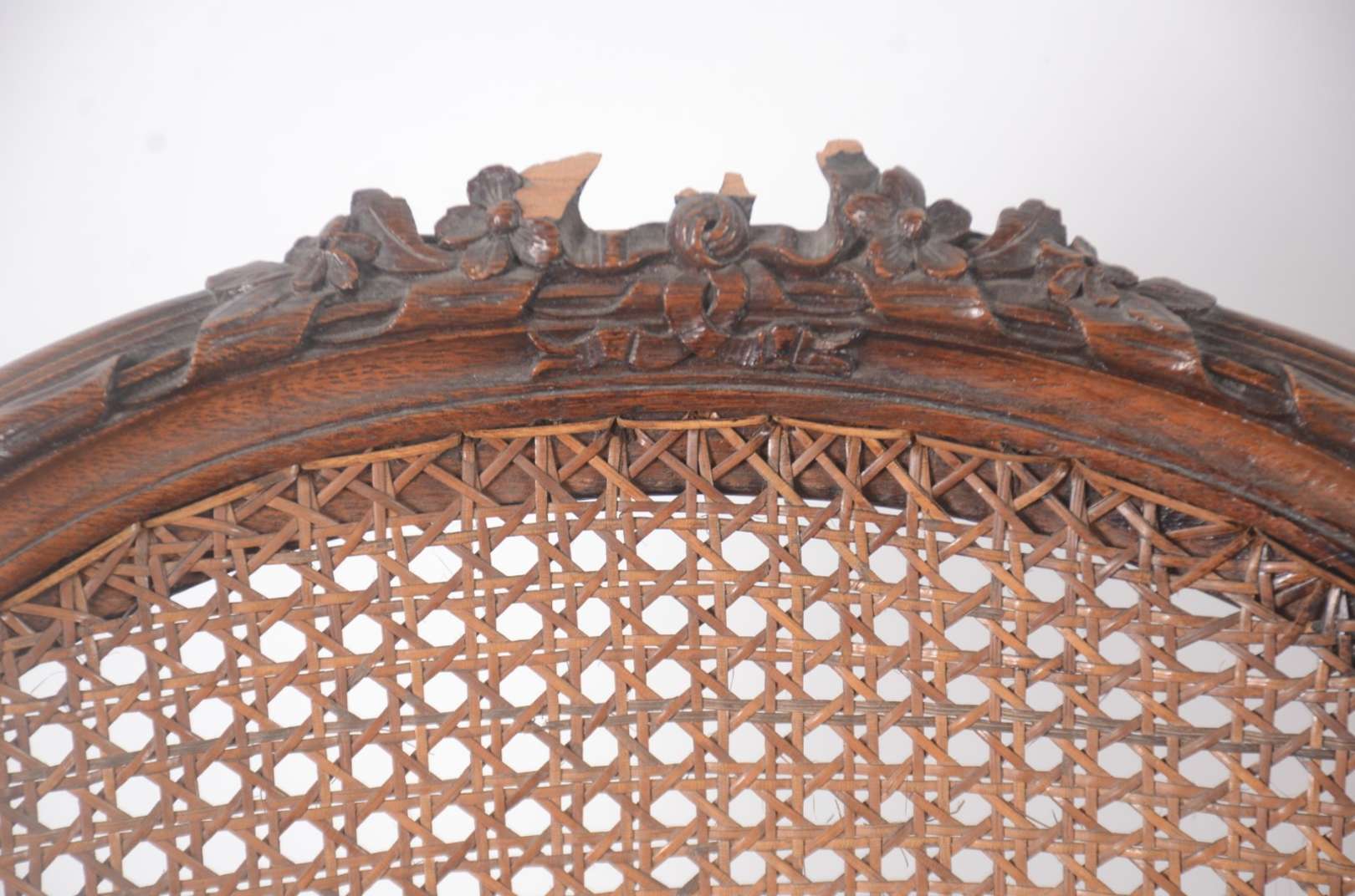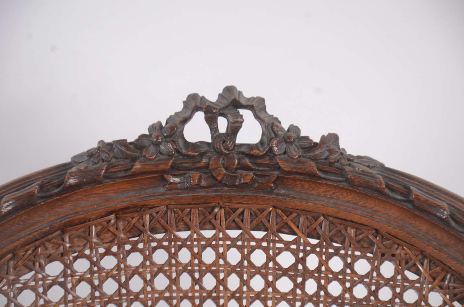 Par de cadeiras de braços de madeira nobre, assentos e encostos estofados e forrados em tecido bege estampado com tac...