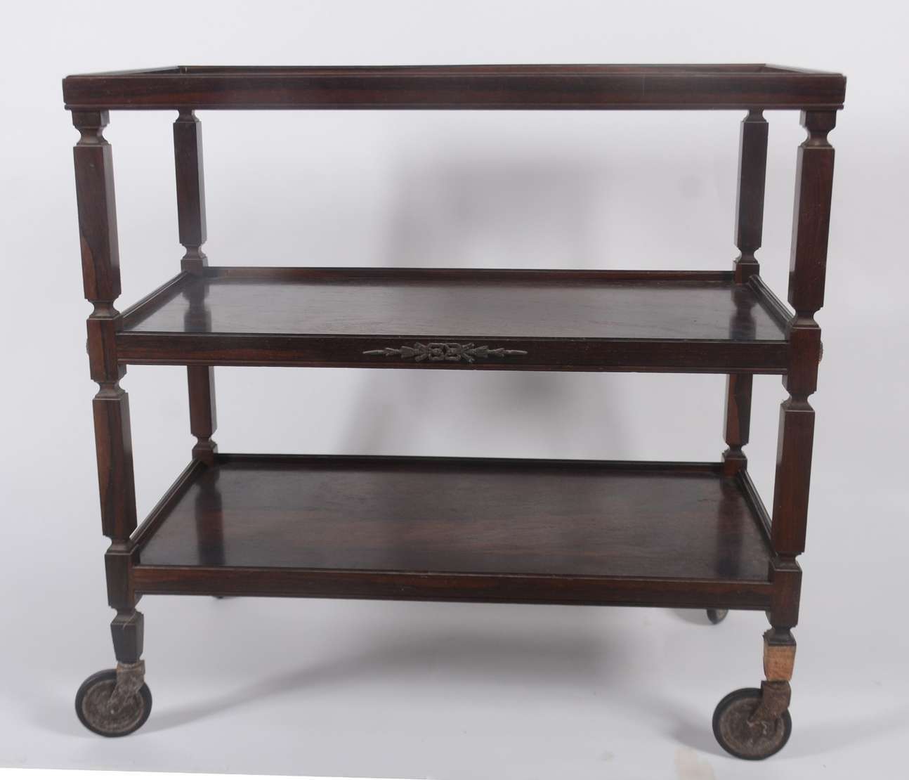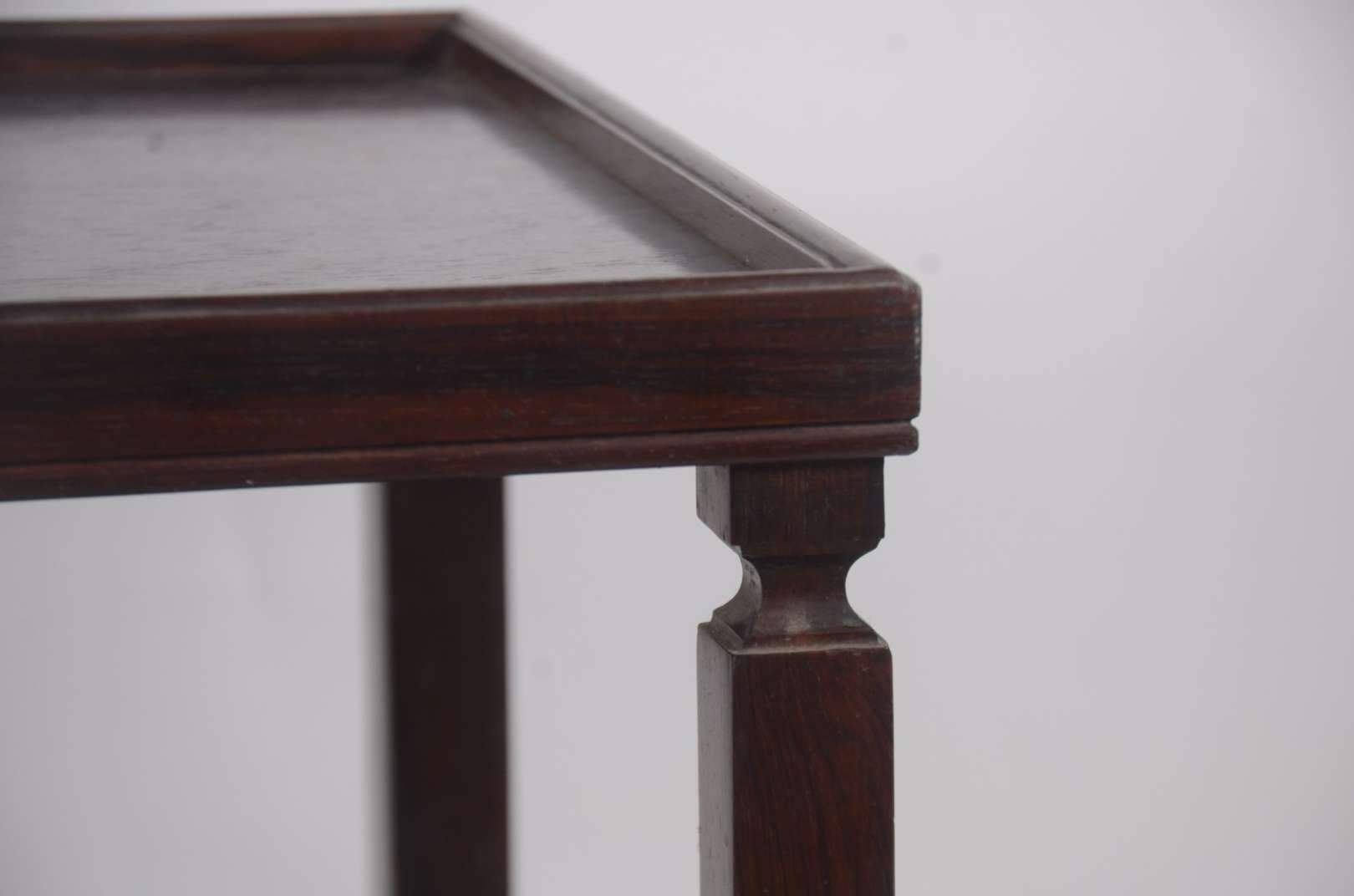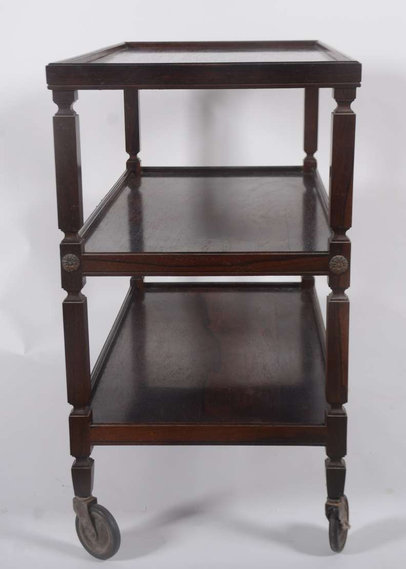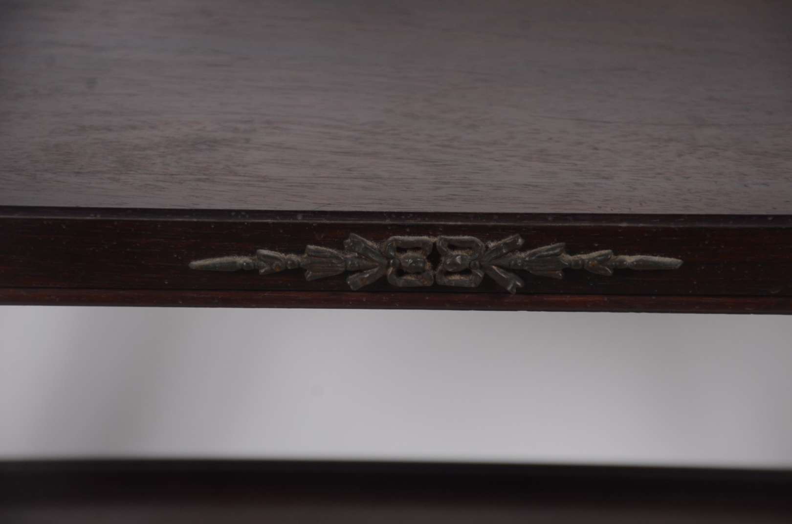 Mesa auxiliar/bar de madeira nobre com 2 gavetas com puxadores de metal, pernas laterais vazadas apoiadas em platô in...
