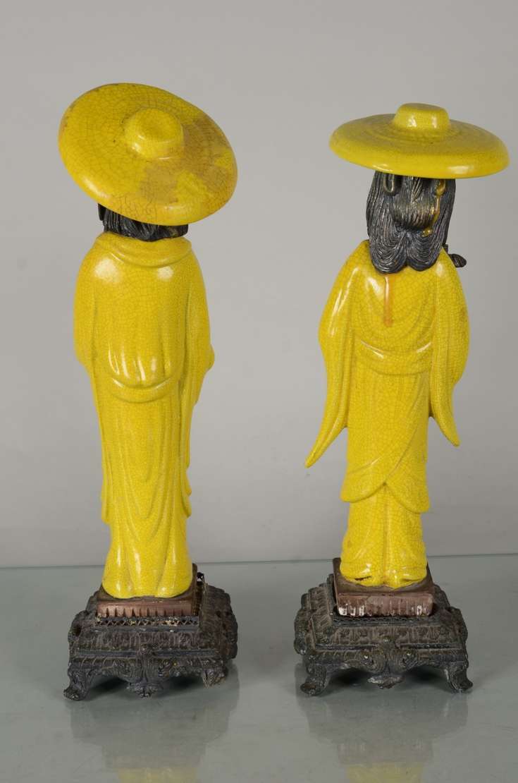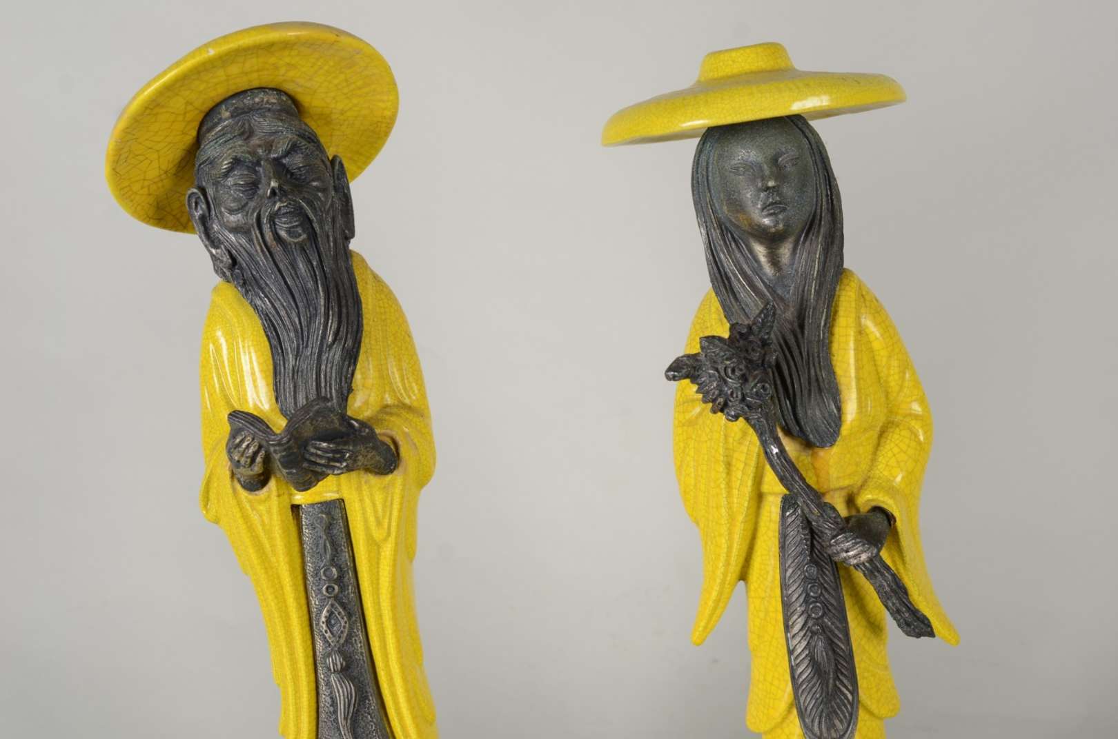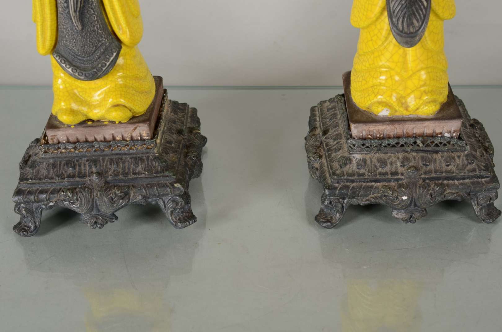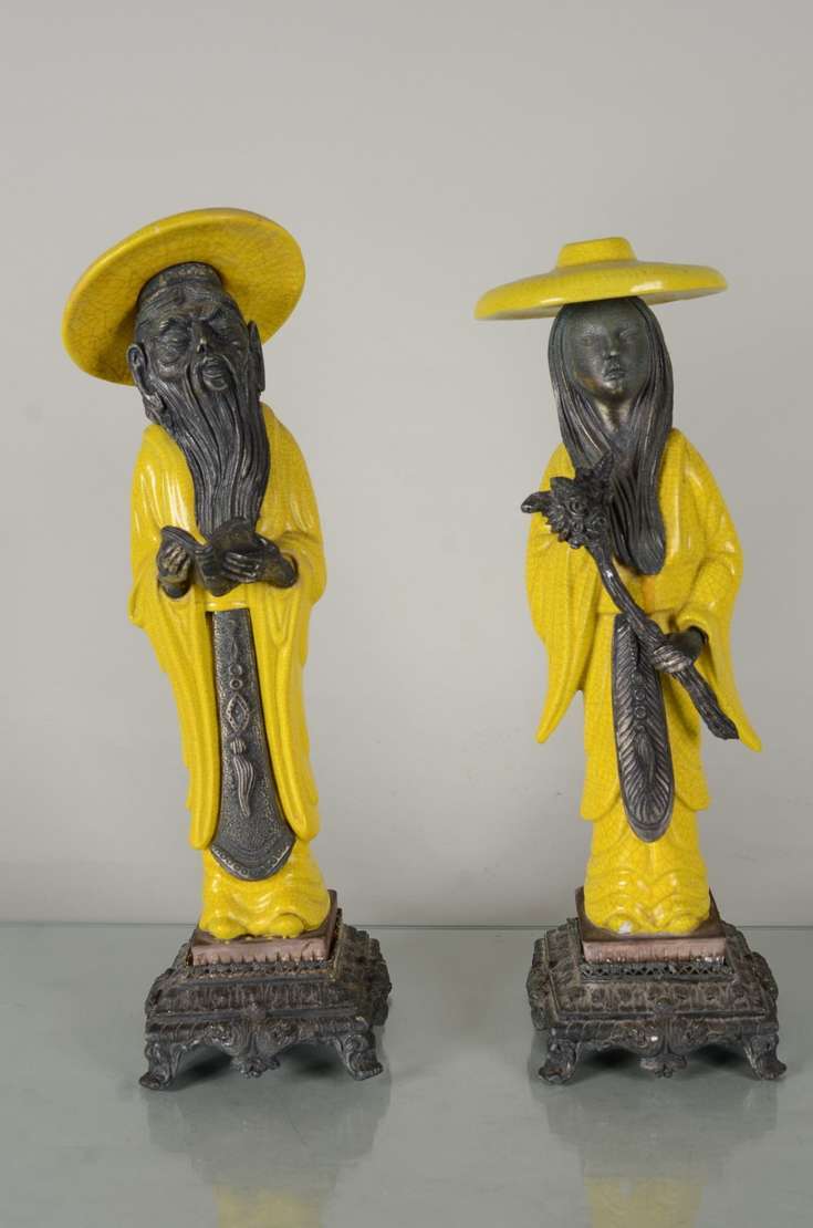 Par de estatuetas orientais de faiança craquelê na cor amarela e metal. (uma delas com o pé da base quebrado).