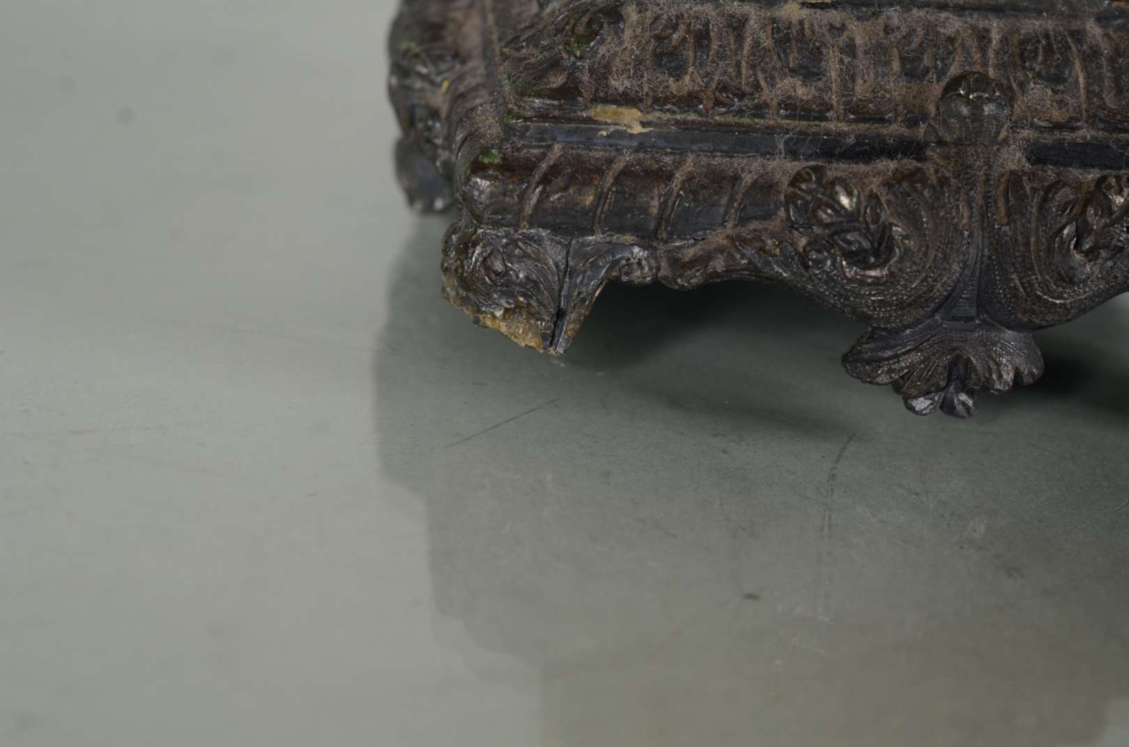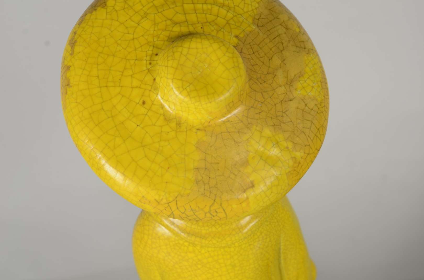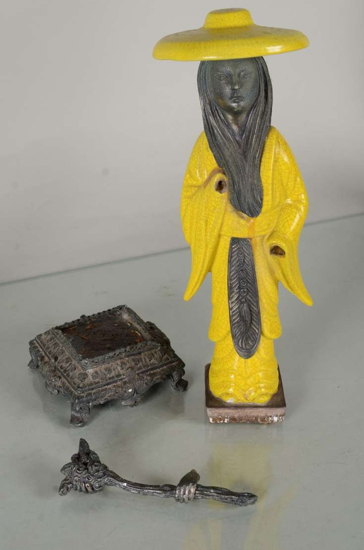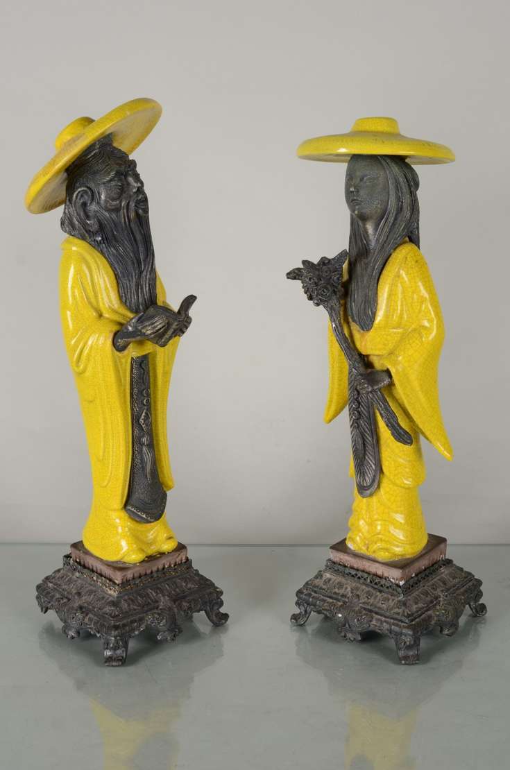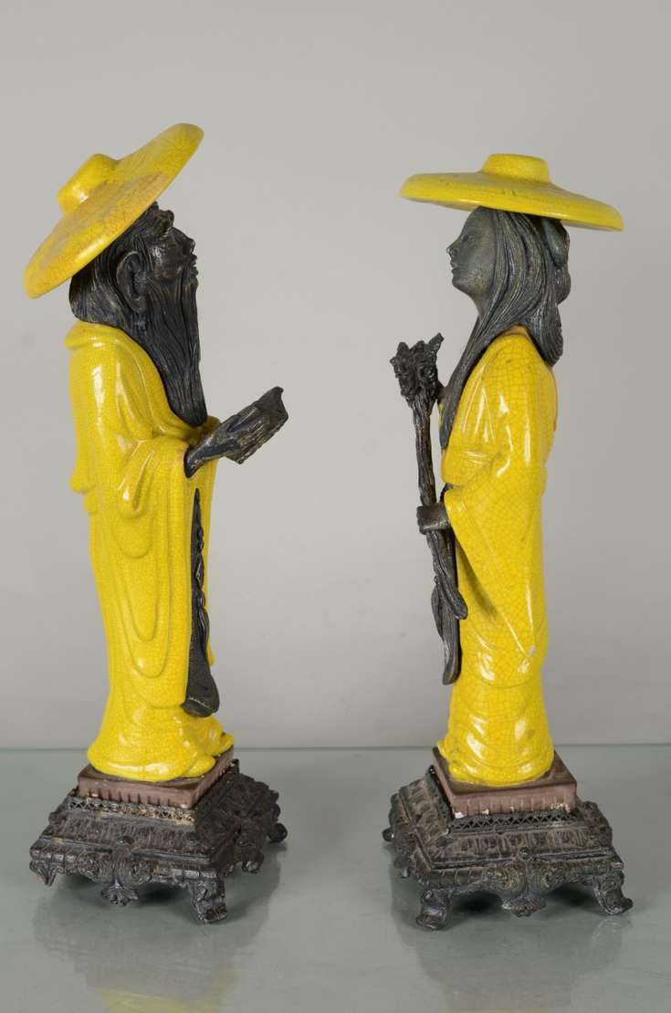 Par de estatuetas orientais de faiança craquelê na cor amarela e metal. (uma delas com o pé da base quebrado).