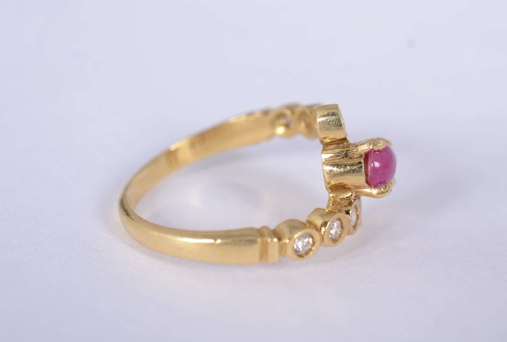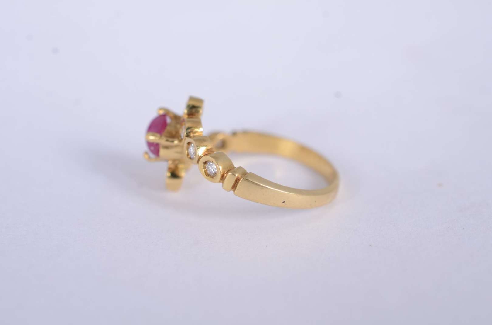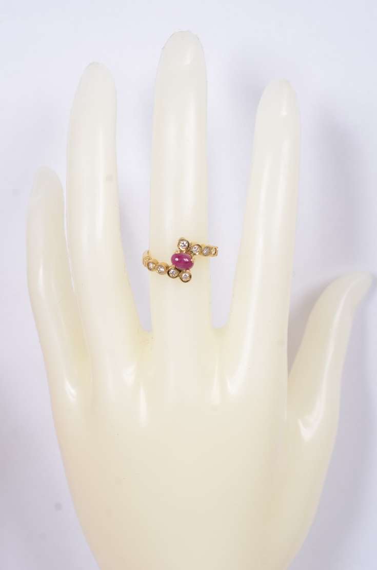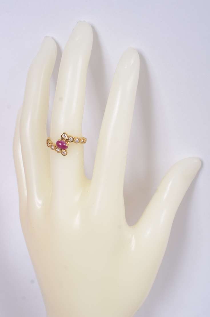 Anel de ouro amarelo 18 k., com 4 rubis e mini brilhantes, aro 19. (Por motivos de segurança a peça não se encontra n...
