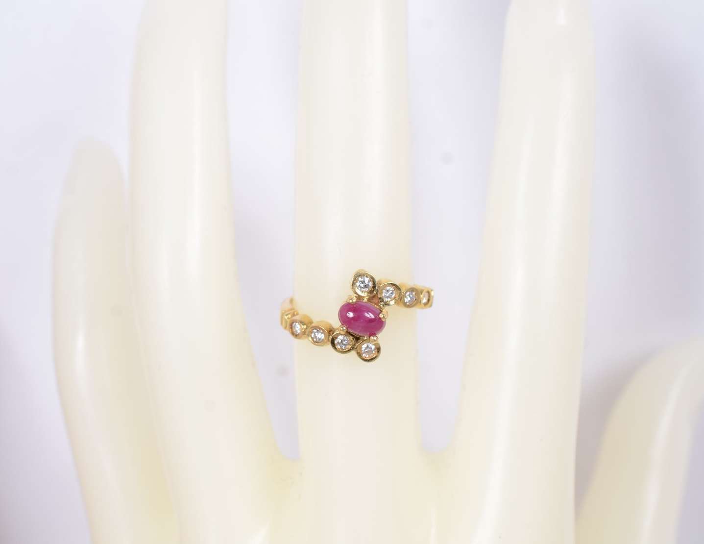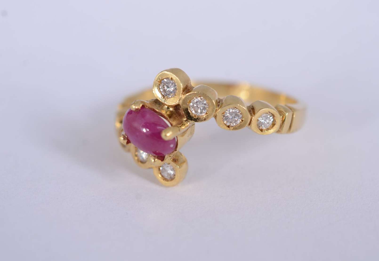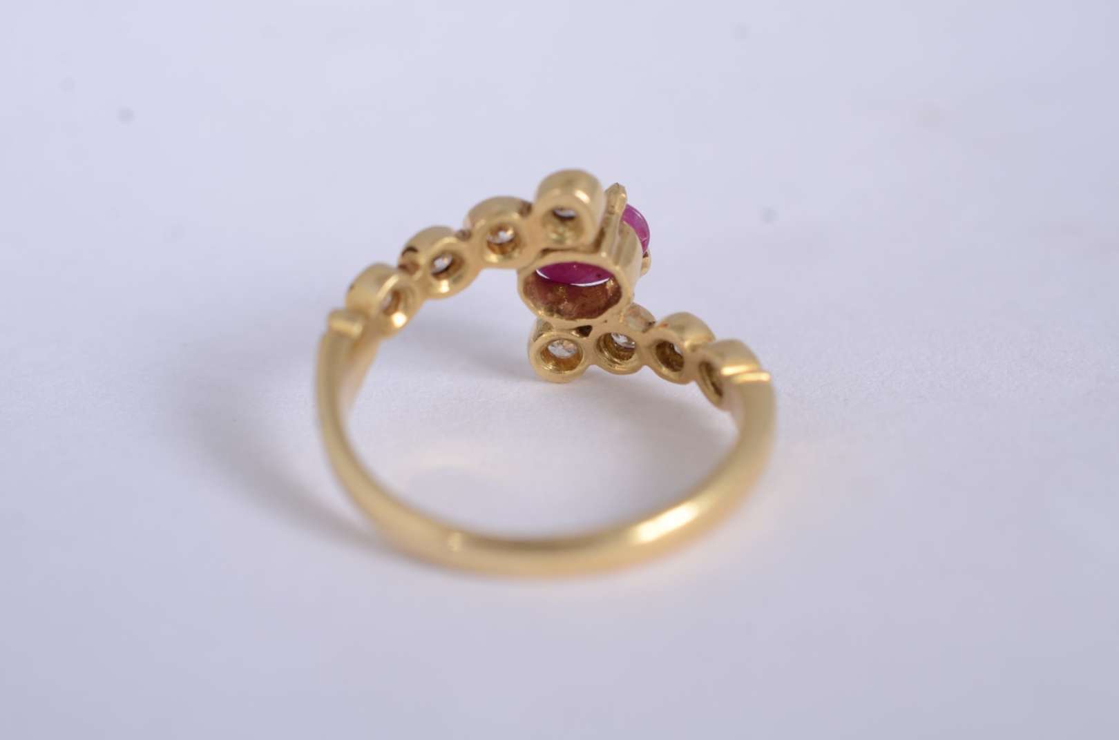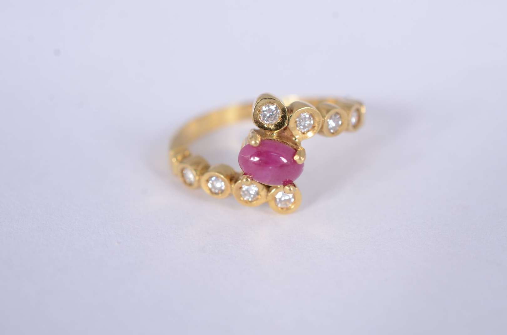 Anel de ouro amarelo 18 k., com 4 rubis e mini brilhantes, aro 19. (Por motivos de segurança a peça não se encontra n...