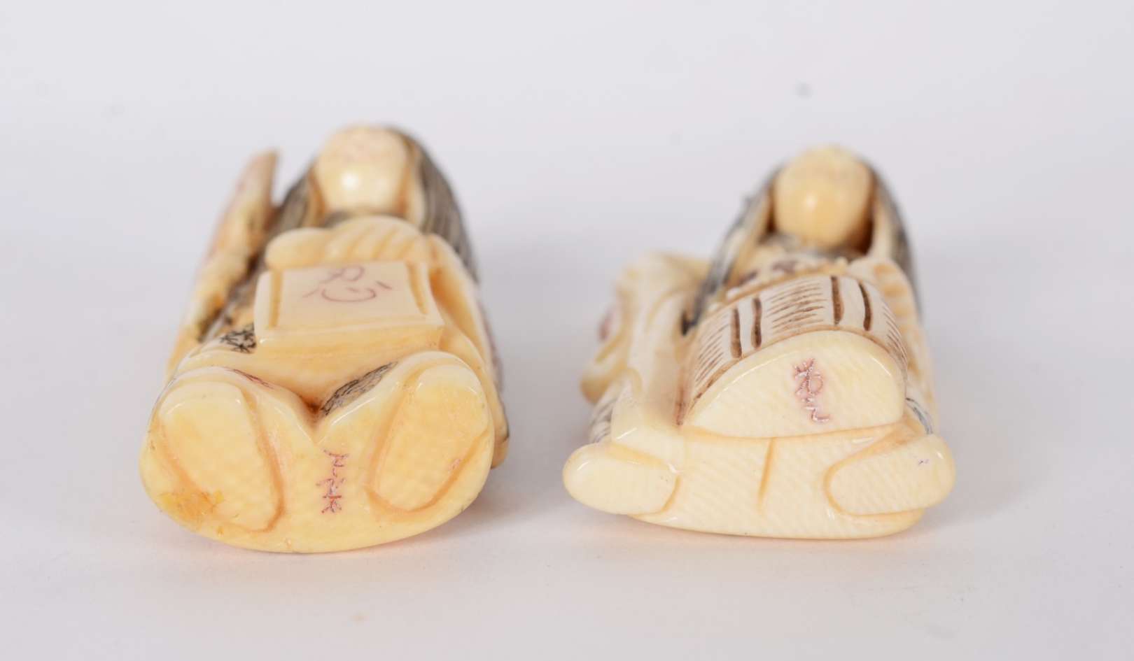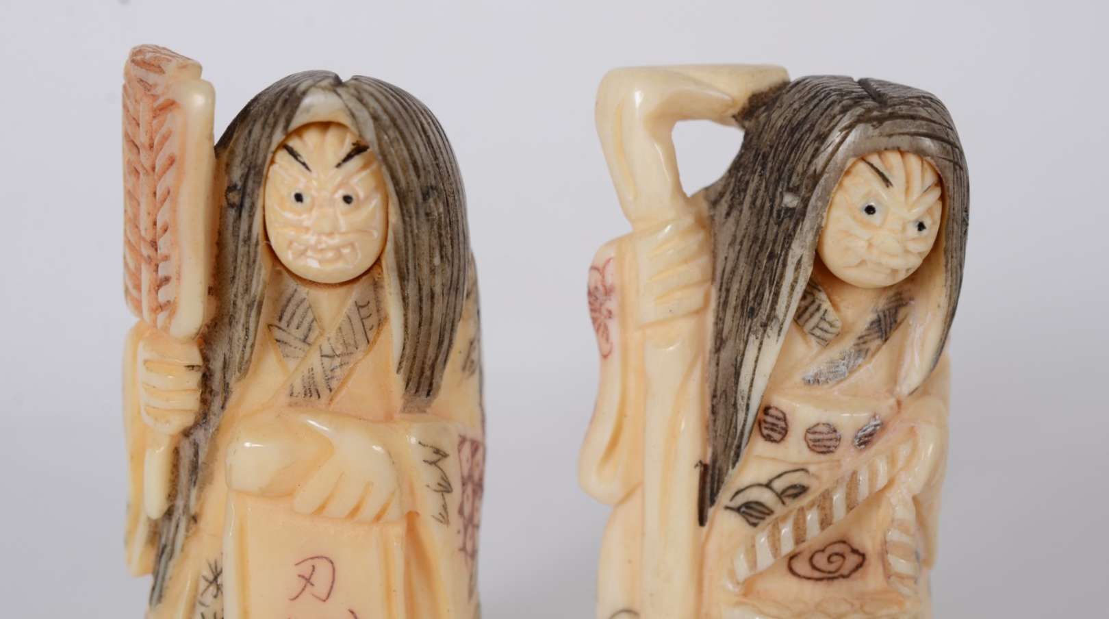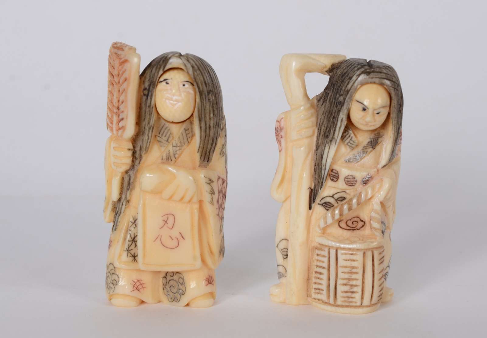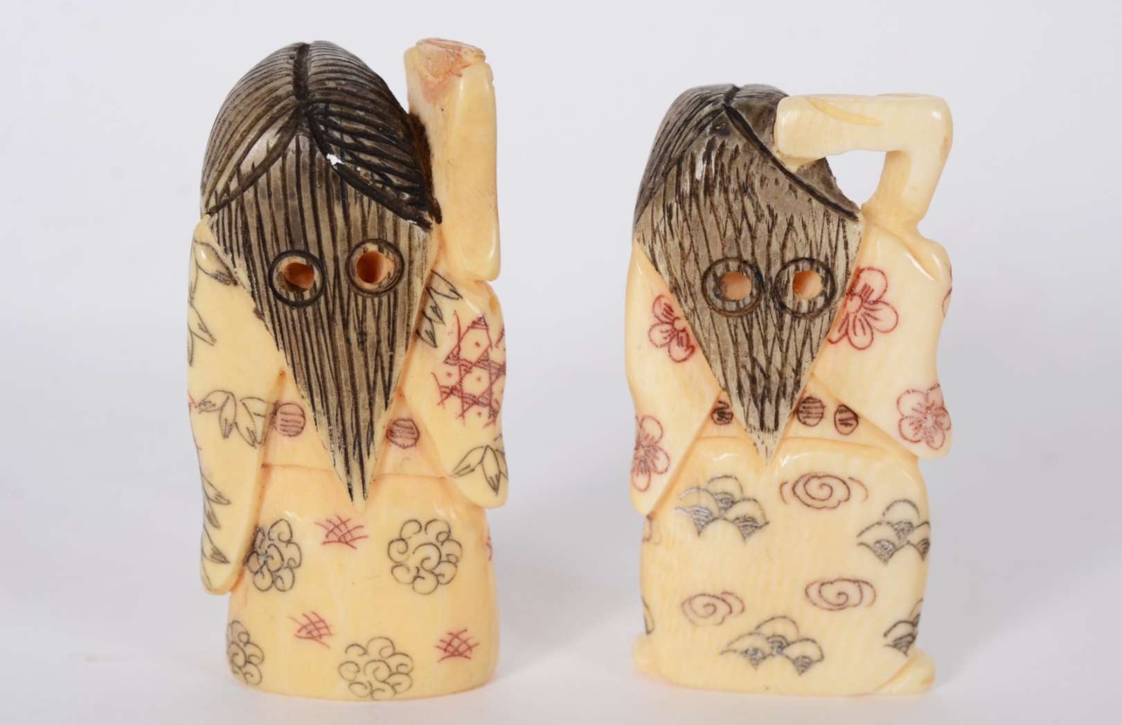 Netsuke de marfim representando pássaro sobre folha, assinado.