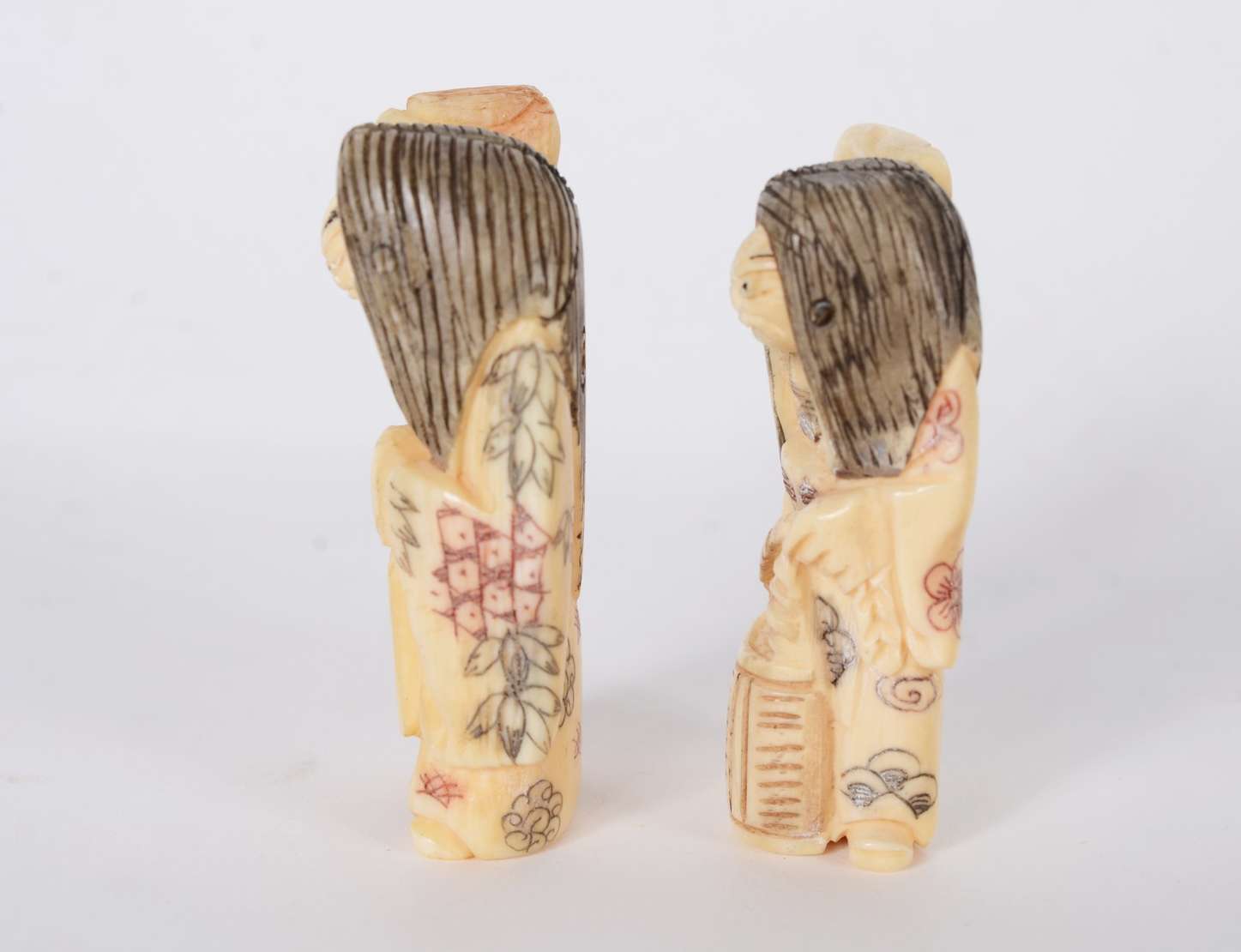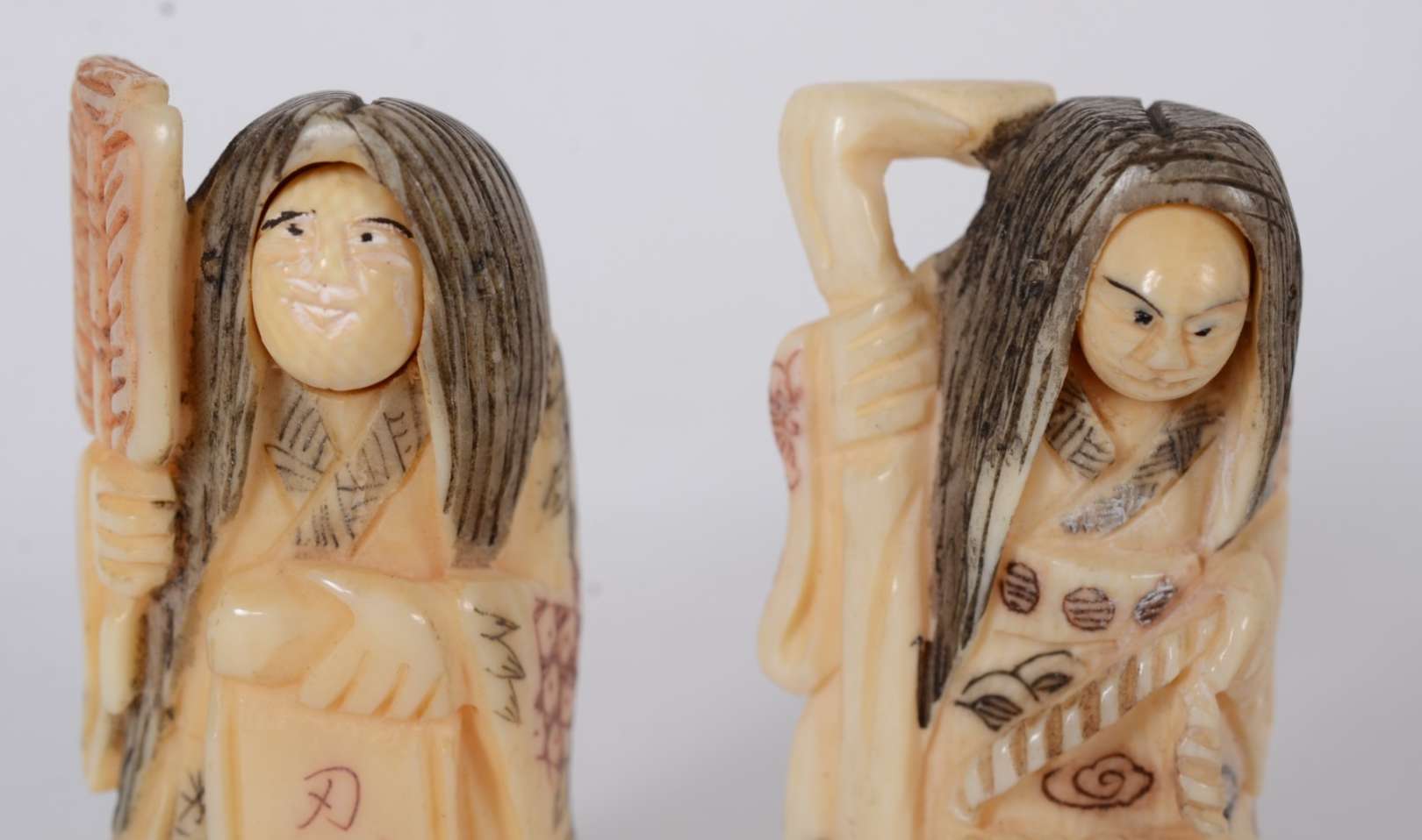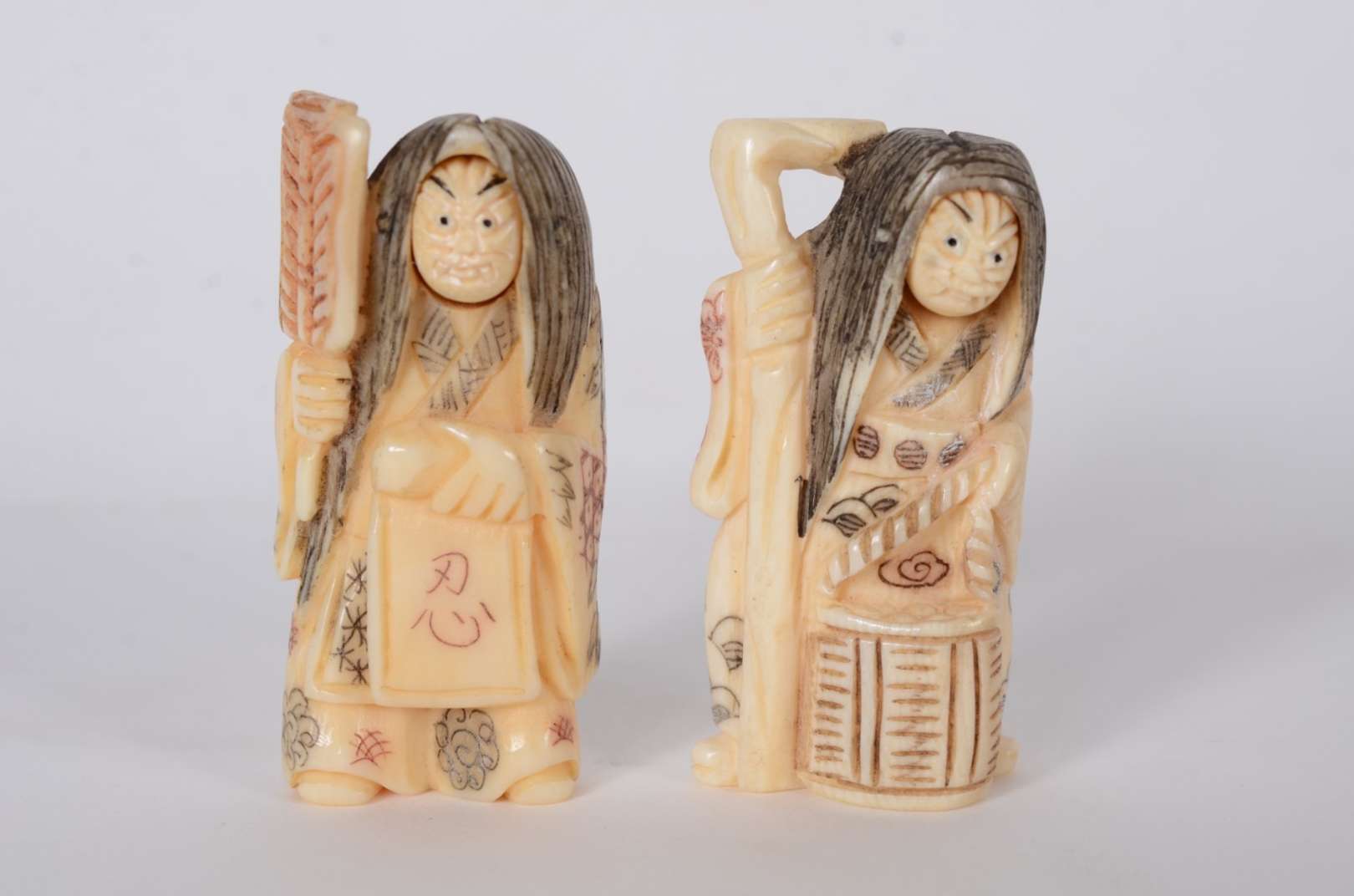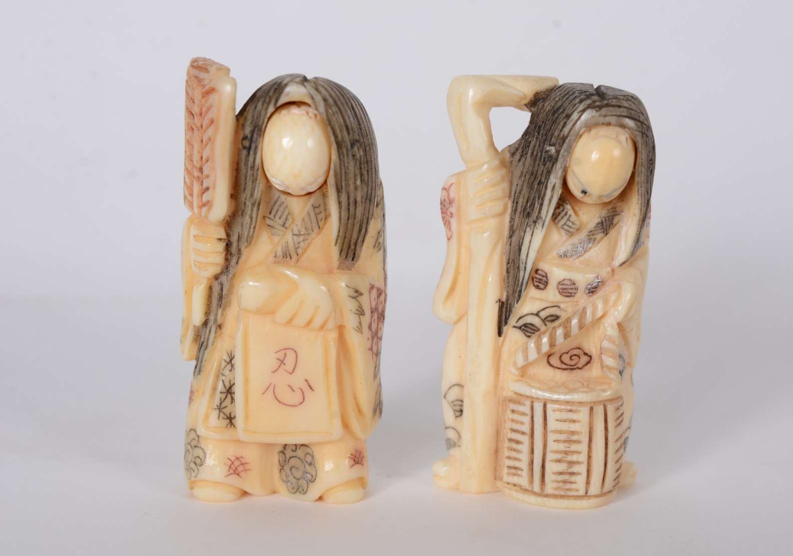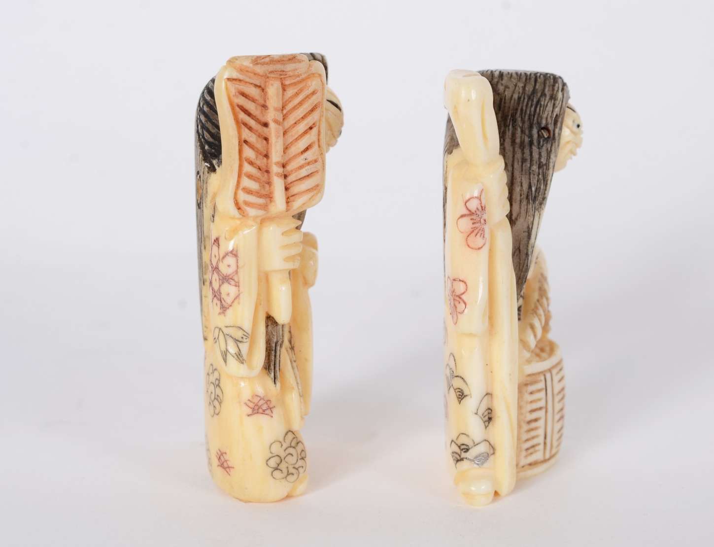 Netsuke de marfim representando pássaro sobre folha, assinado.