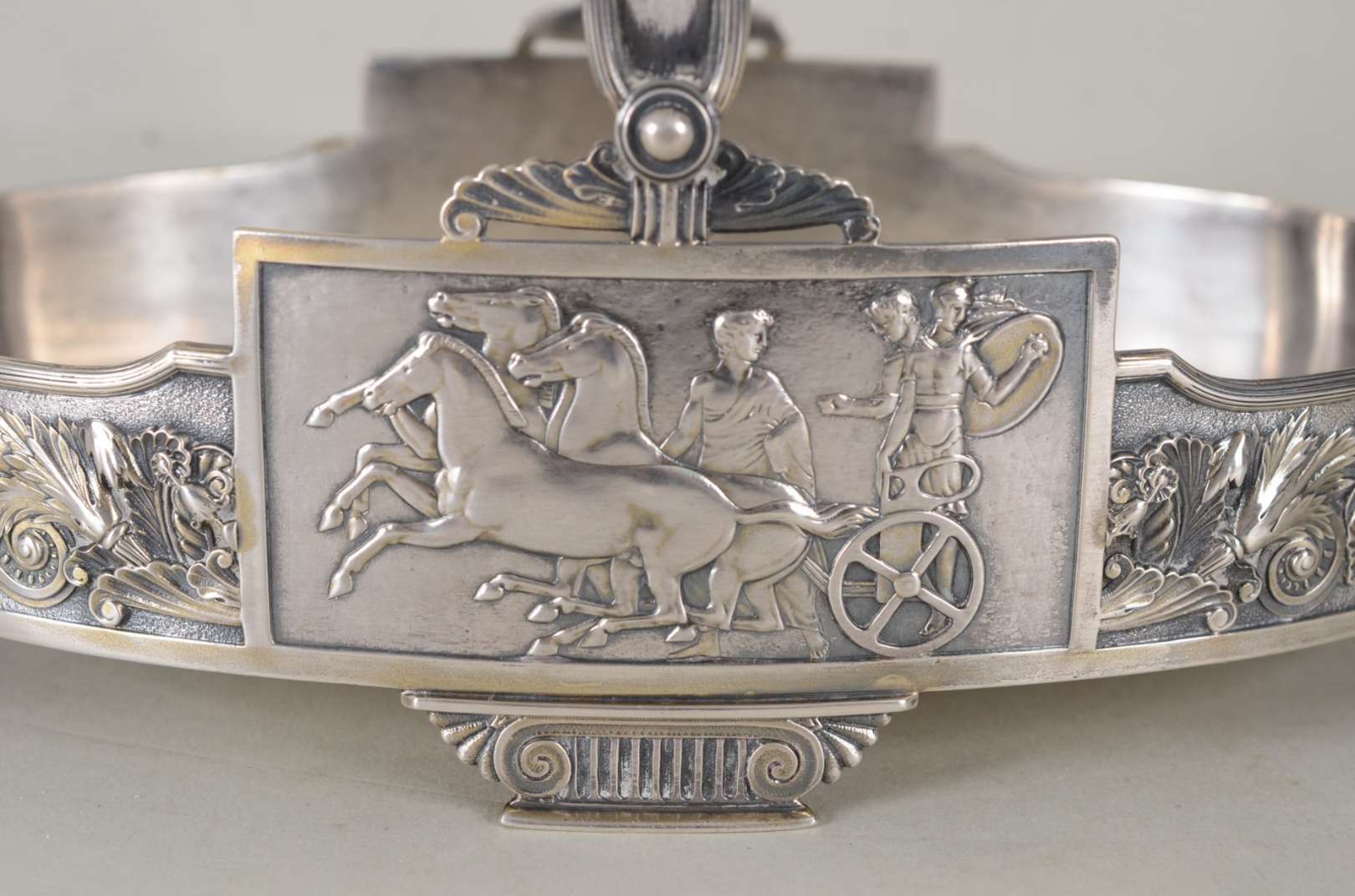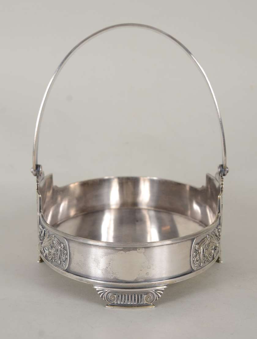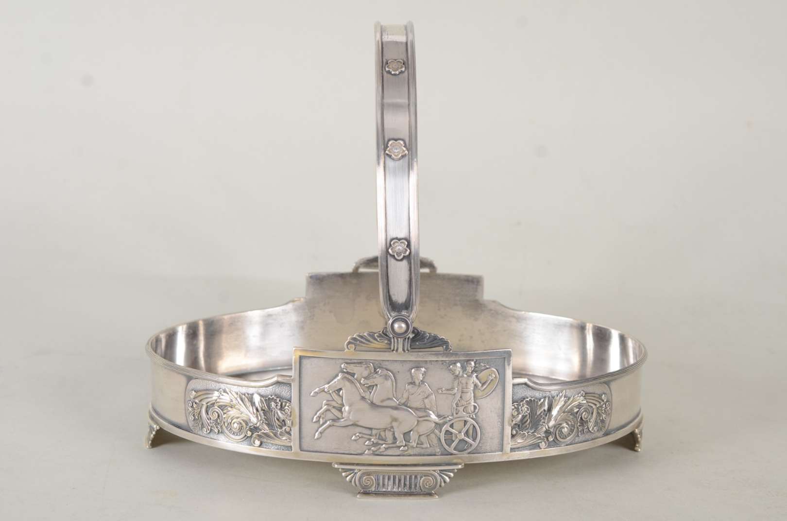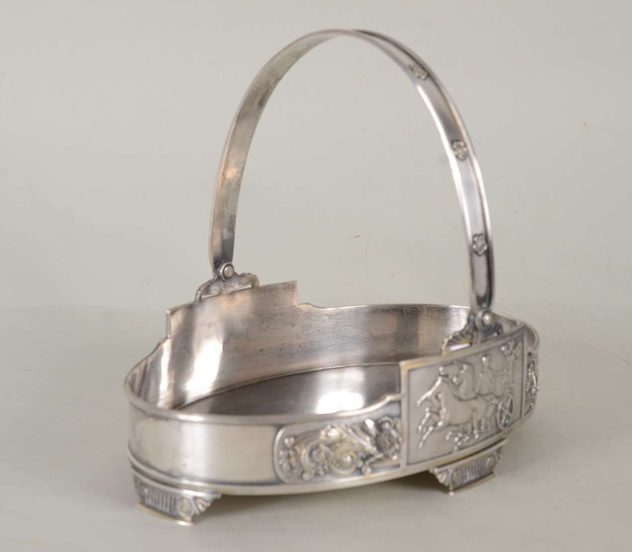 Cesta com alça de prata Sterling contrastada, lateral decorada com figuras em relevo. Peso da prata: 810 g. (Por motivos de segurança a peça não se encontra na loja)