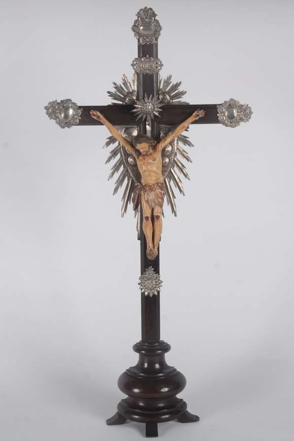 Crucifixo de madeira nobre com figura de Cristo ricamente entalhada e policromada, guarnição de prata. Braço restaurado.