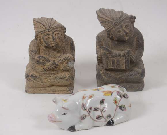 Diversas peças, sendo: 2 figuras de pedra (pequeno lascado numa delas) e estatueta de porcelana oriental policromada ...