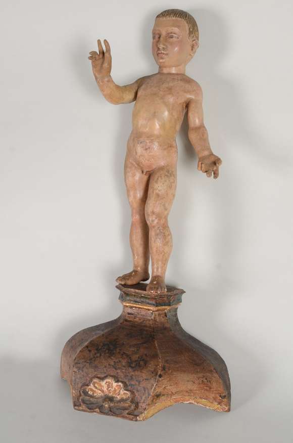Menino Deus - Antiga imagem de madeira policromada sobre pedestal arredondado com realces dourados. Século XIX.