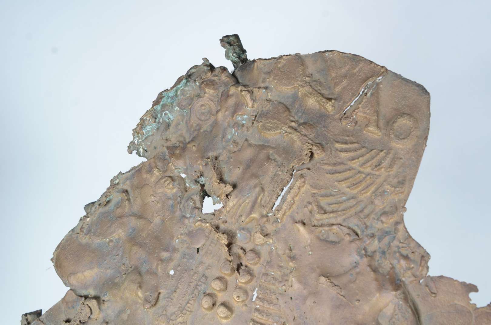 Placa oriental de madeira ricamente entalhada e dourada representando guerreiros a cavalo.