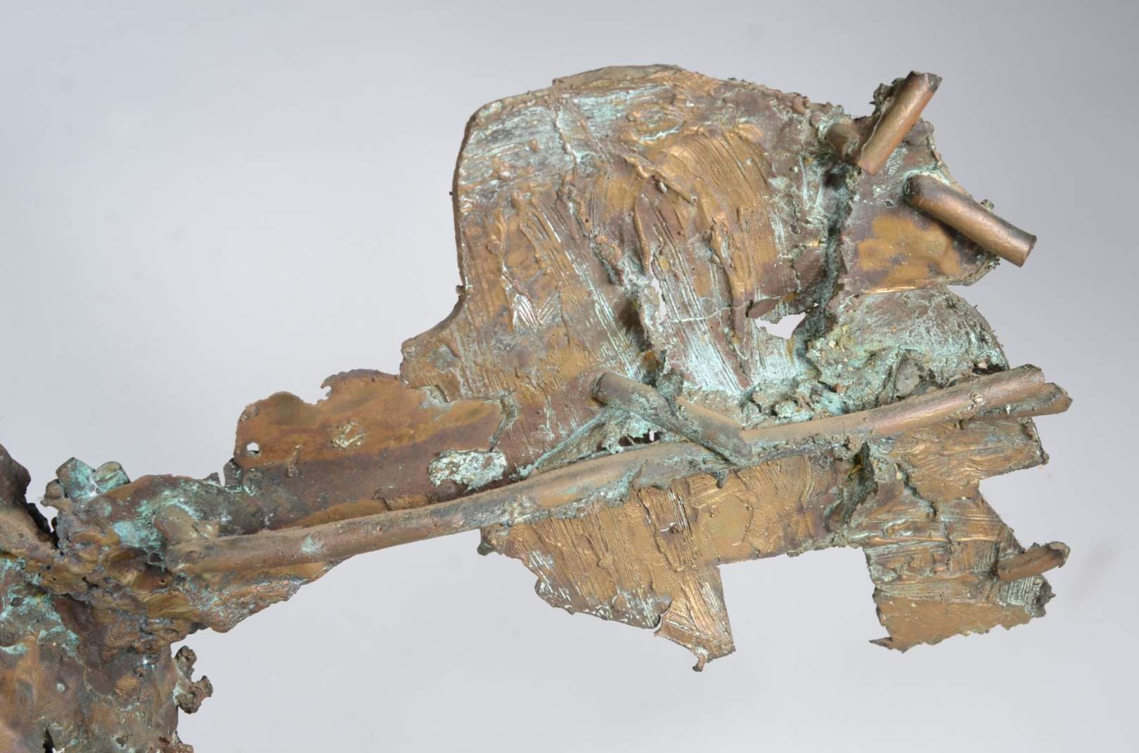 Antigo crucifixo com figura de Cristo ricamente entalhada e policromada, resplendor de prata. Base e ponteiras douradas.