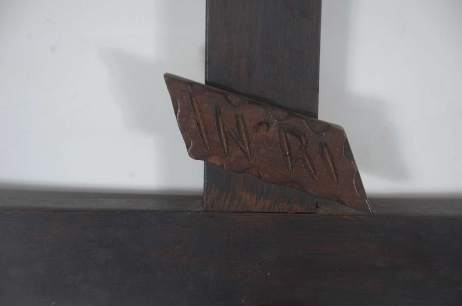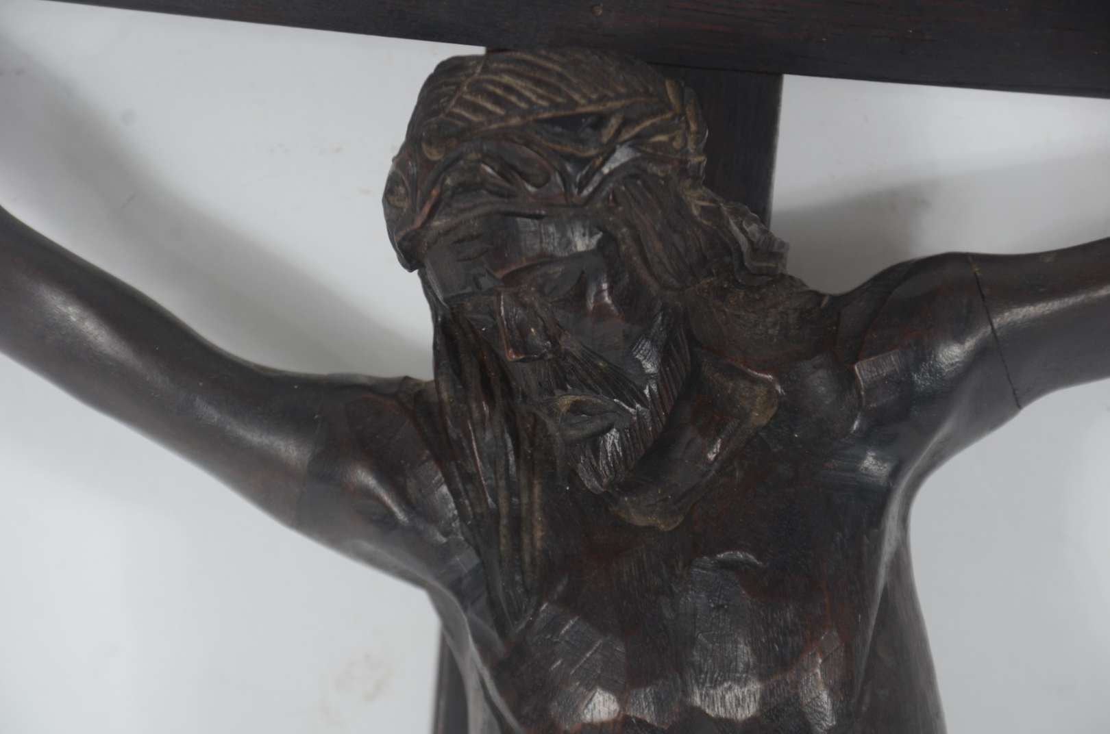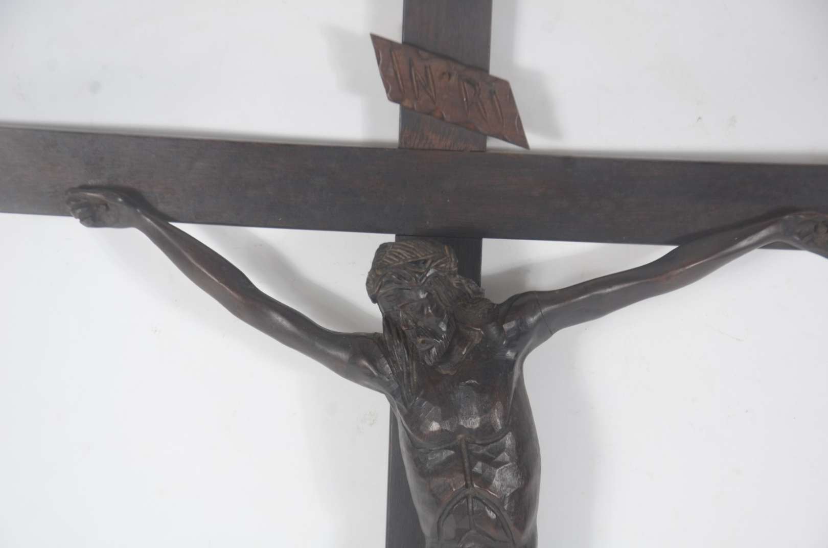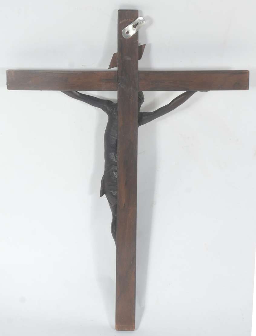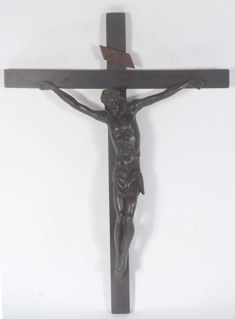Antigo crucifixo com figura de Cristo ricamente entalhada e policromada, resplendor de prata. Base e ponteiras douradas.
