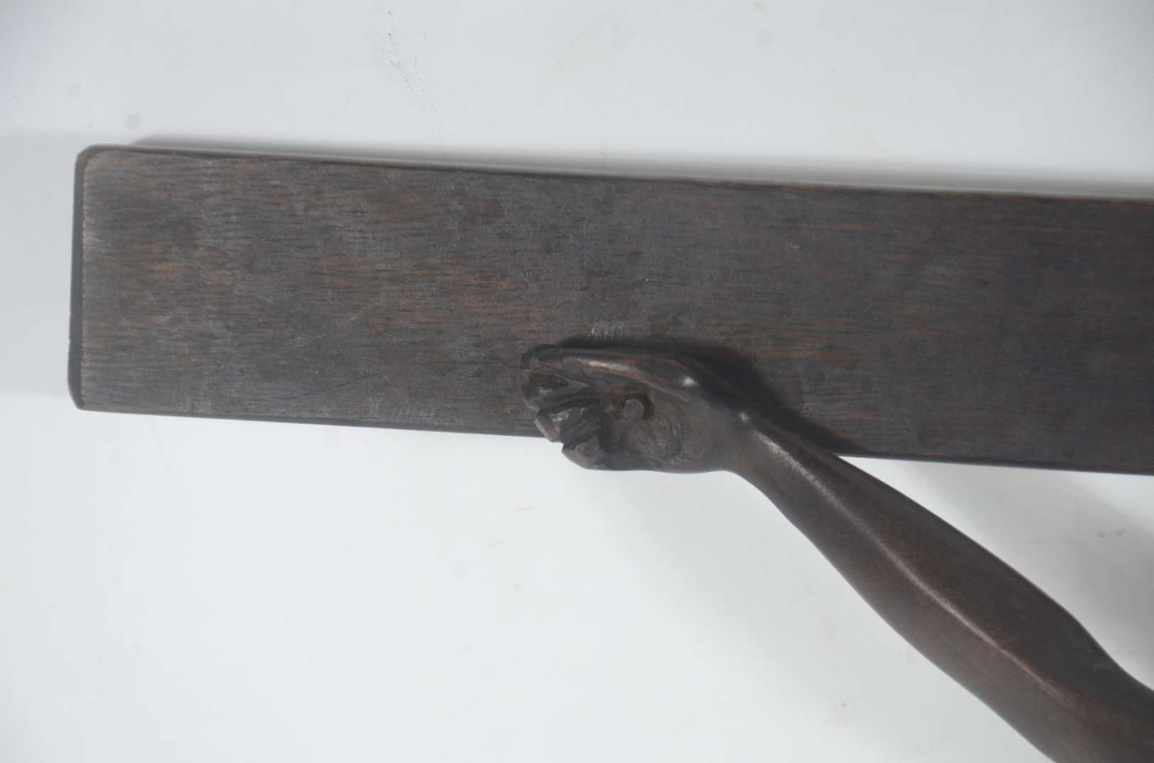 Escultura de metal representando figura do sincretismo religioso. Com oxidações.