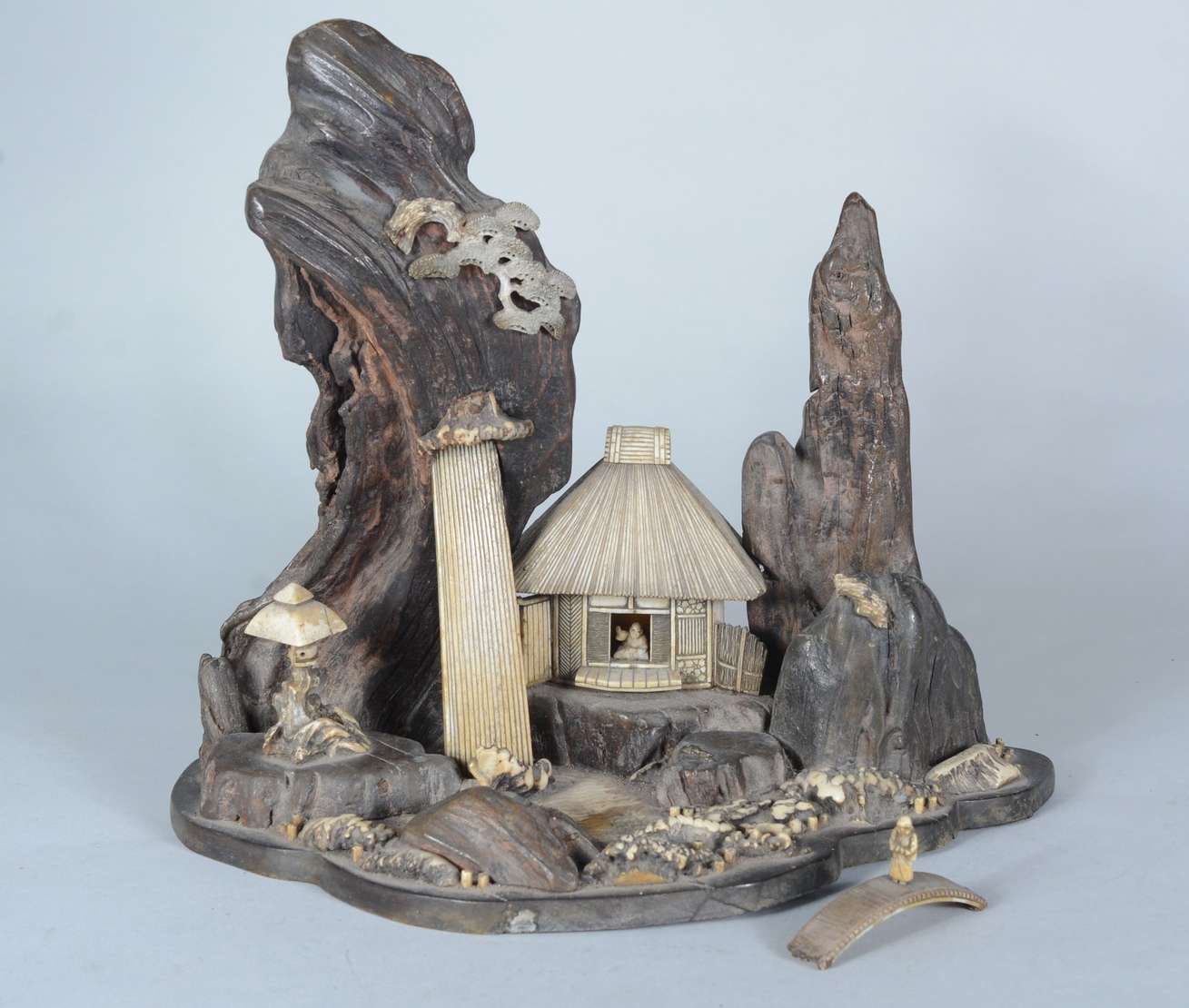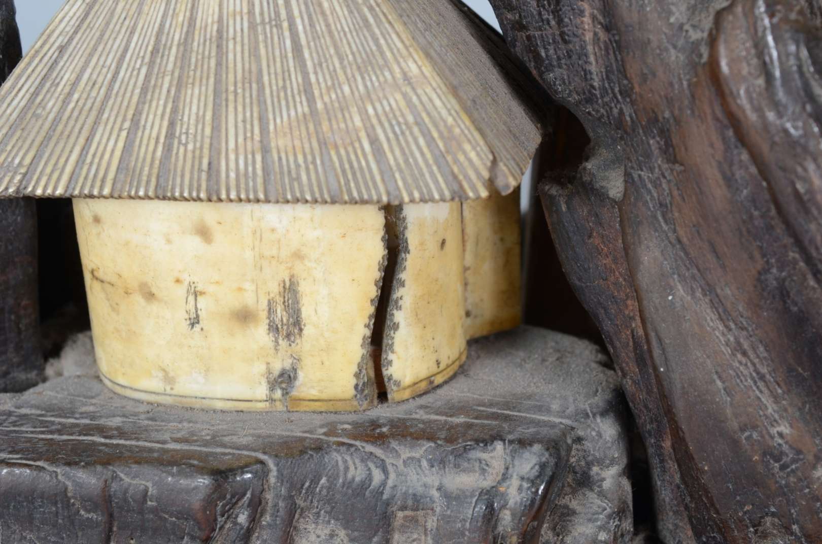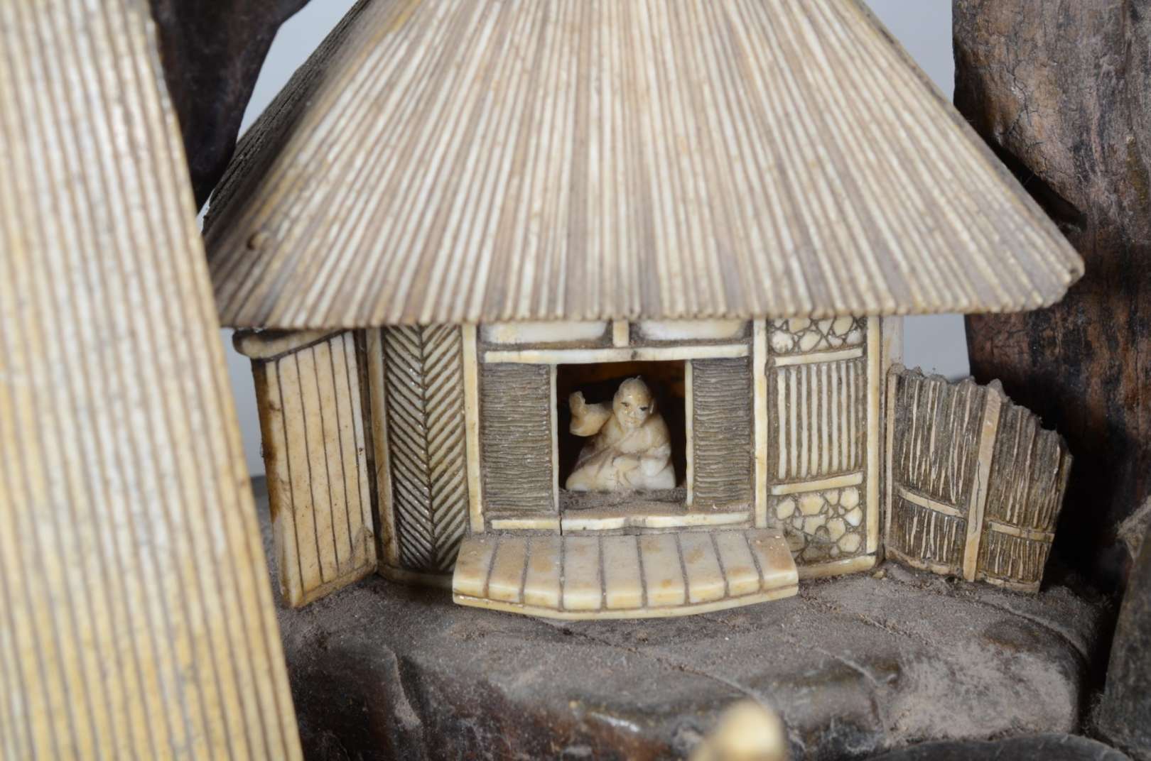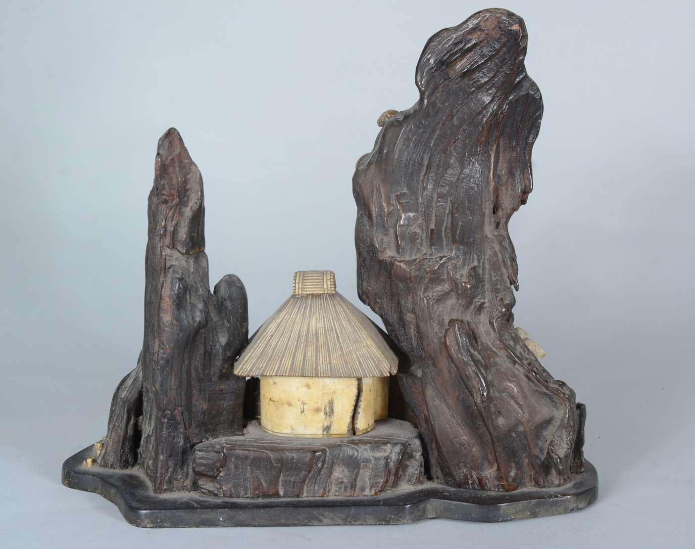 Grupo escultórico oriental com partes de madeira e materiais córneos representando "pequena habitação nas montanhas". Desgastes e pequenos defeitos.