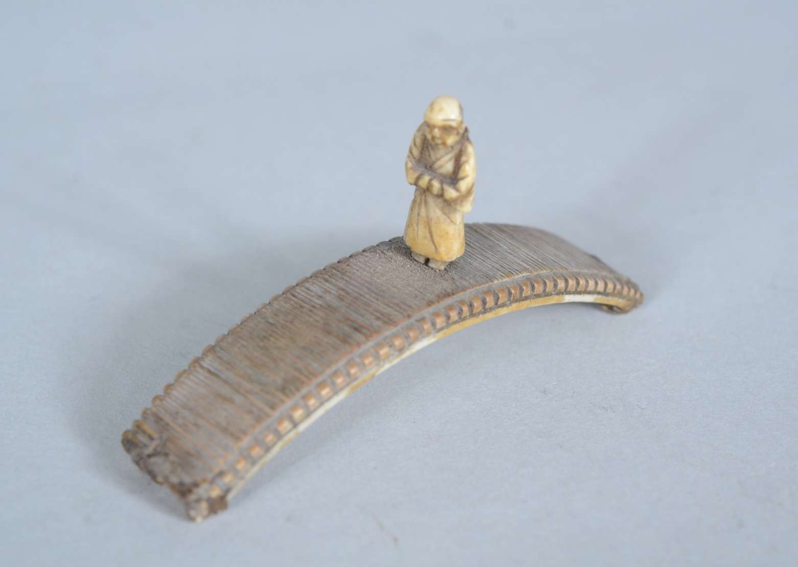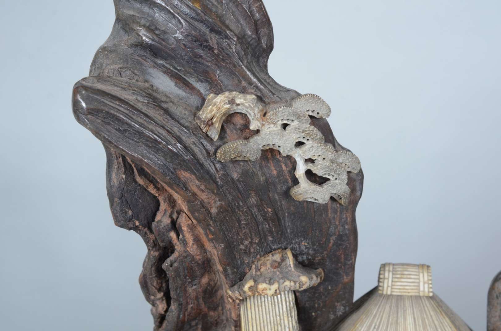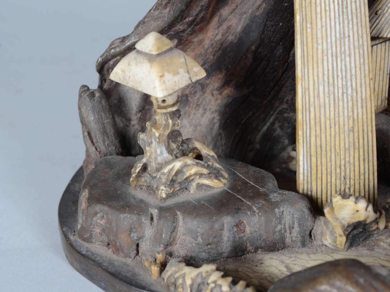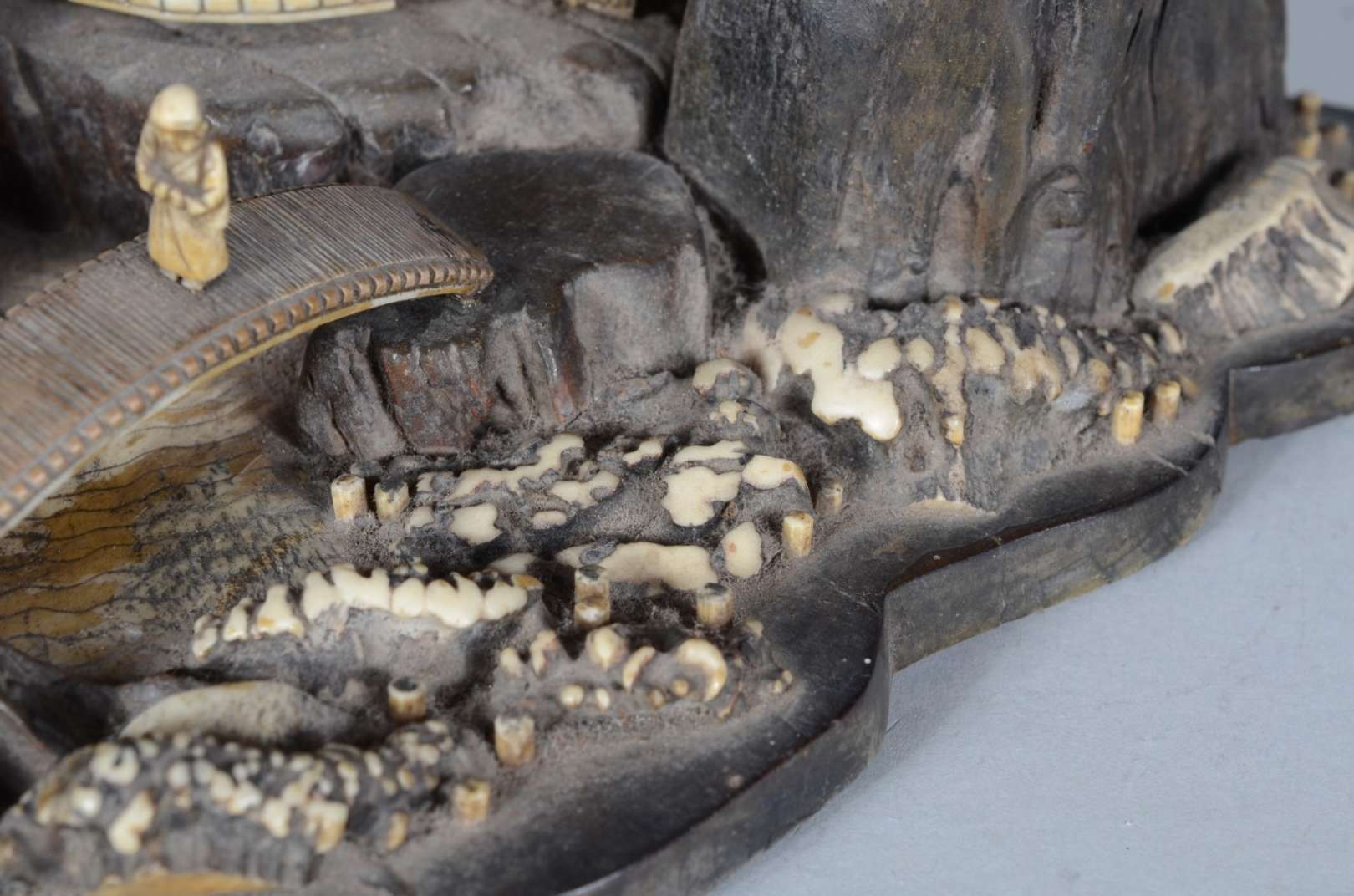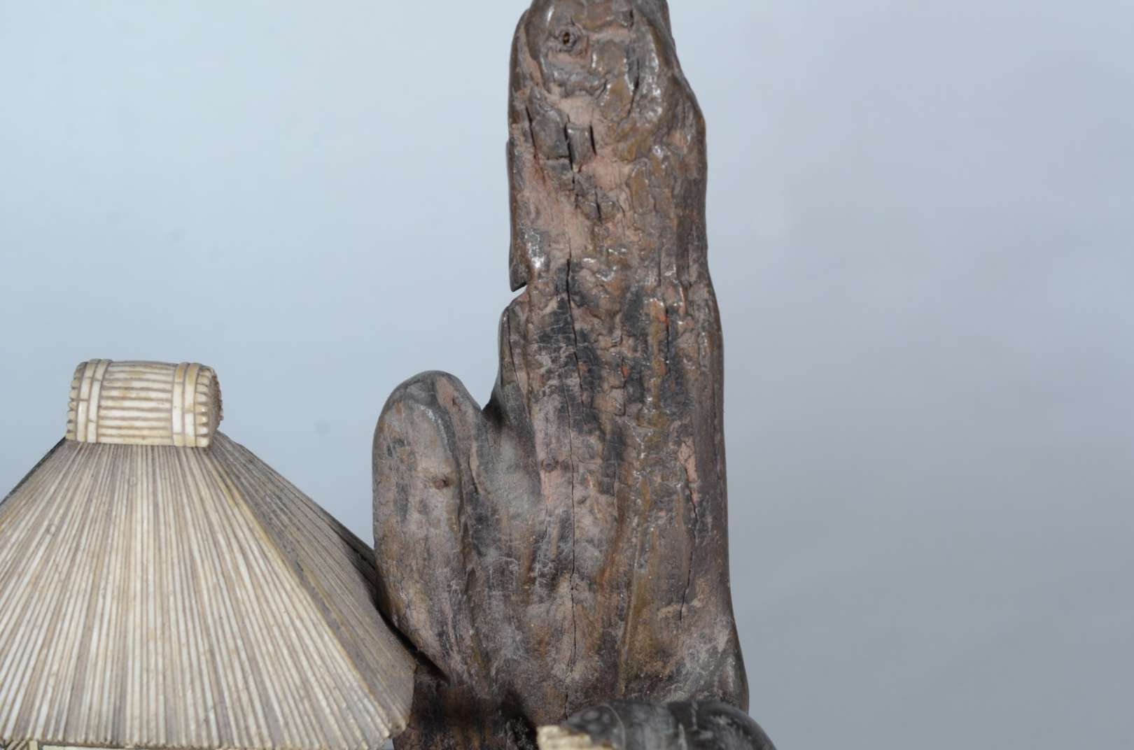 Grupo escultórico oriental com partes de madeira e materiais córneos representando "pequena habitação nas montanhas". Desgastes e pequenos defeitos.