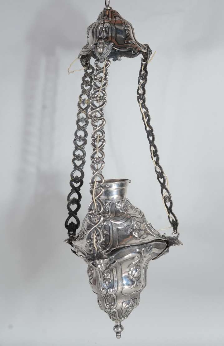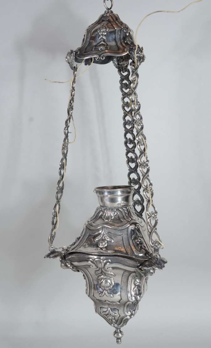 Tocheiro para luz elétrica de madeira entalhada e patinada.
