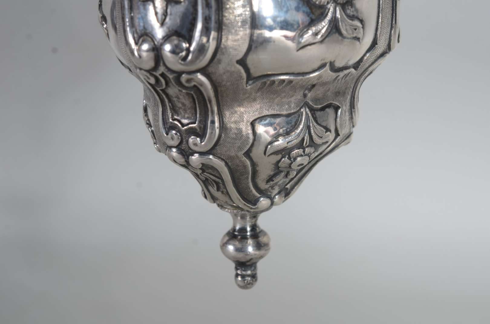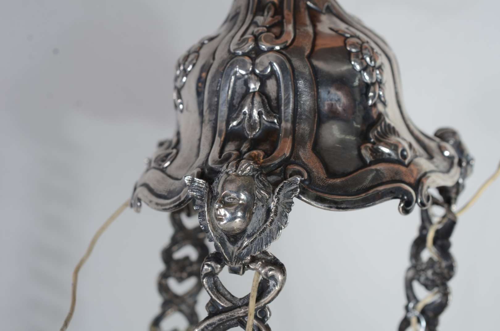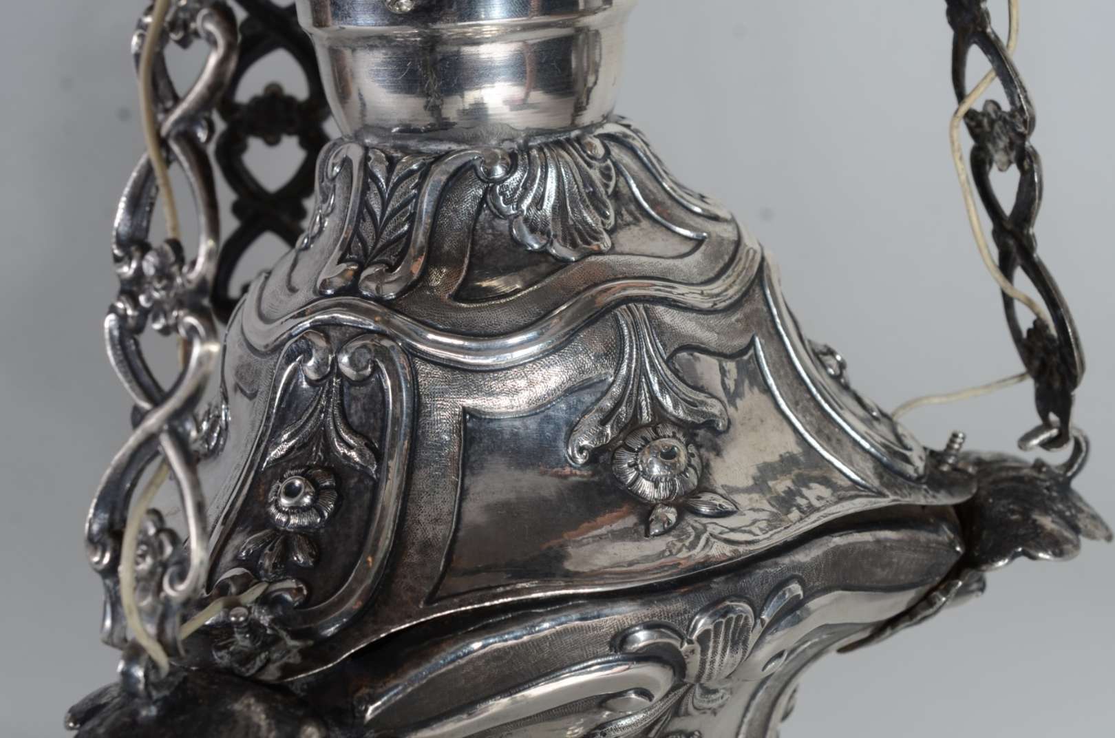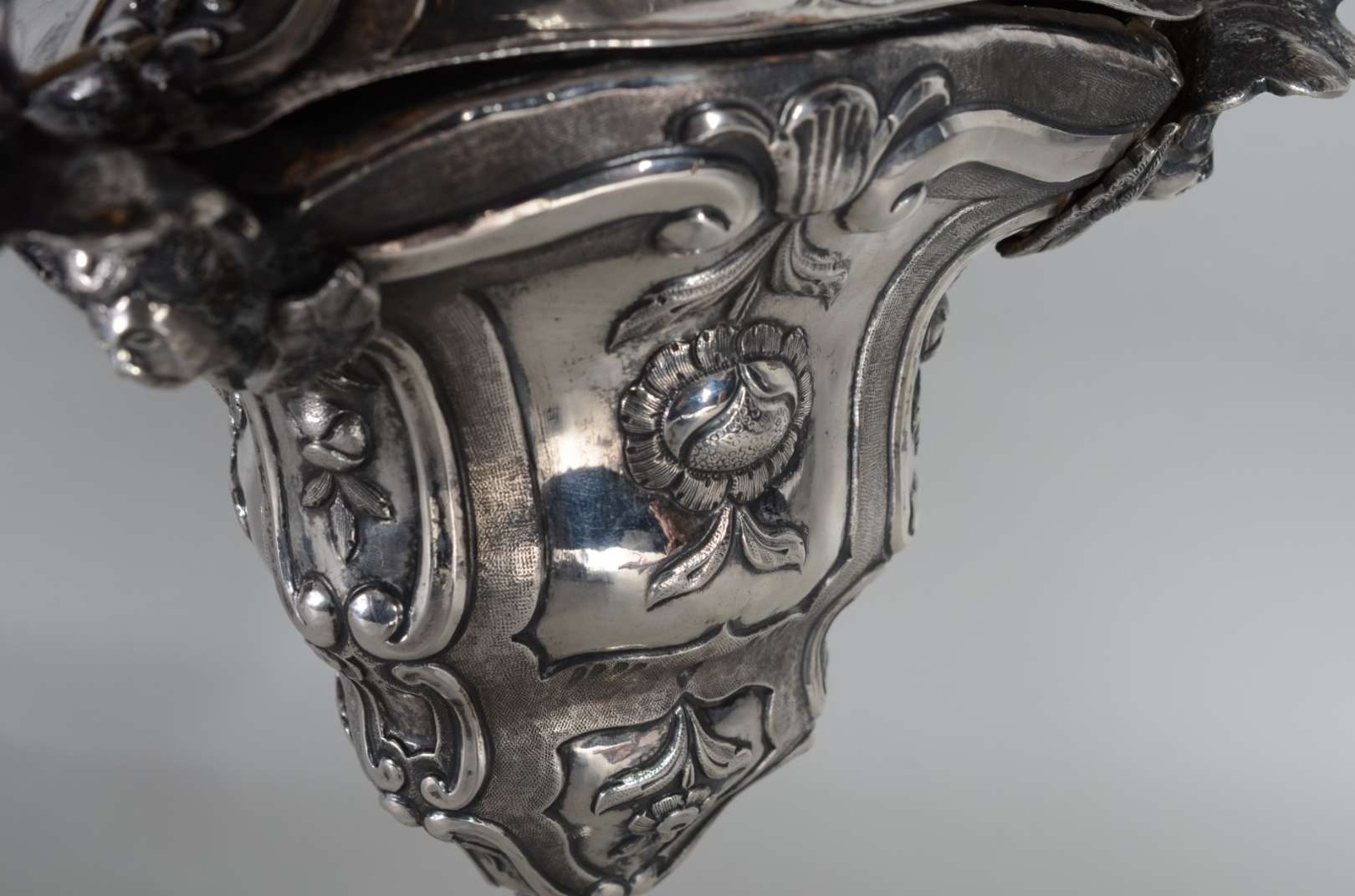 Candelabro de prata portuguesa contraste P Coroa, para 4 velas, trabalhado com concheados e flores em relevo. Peso t...