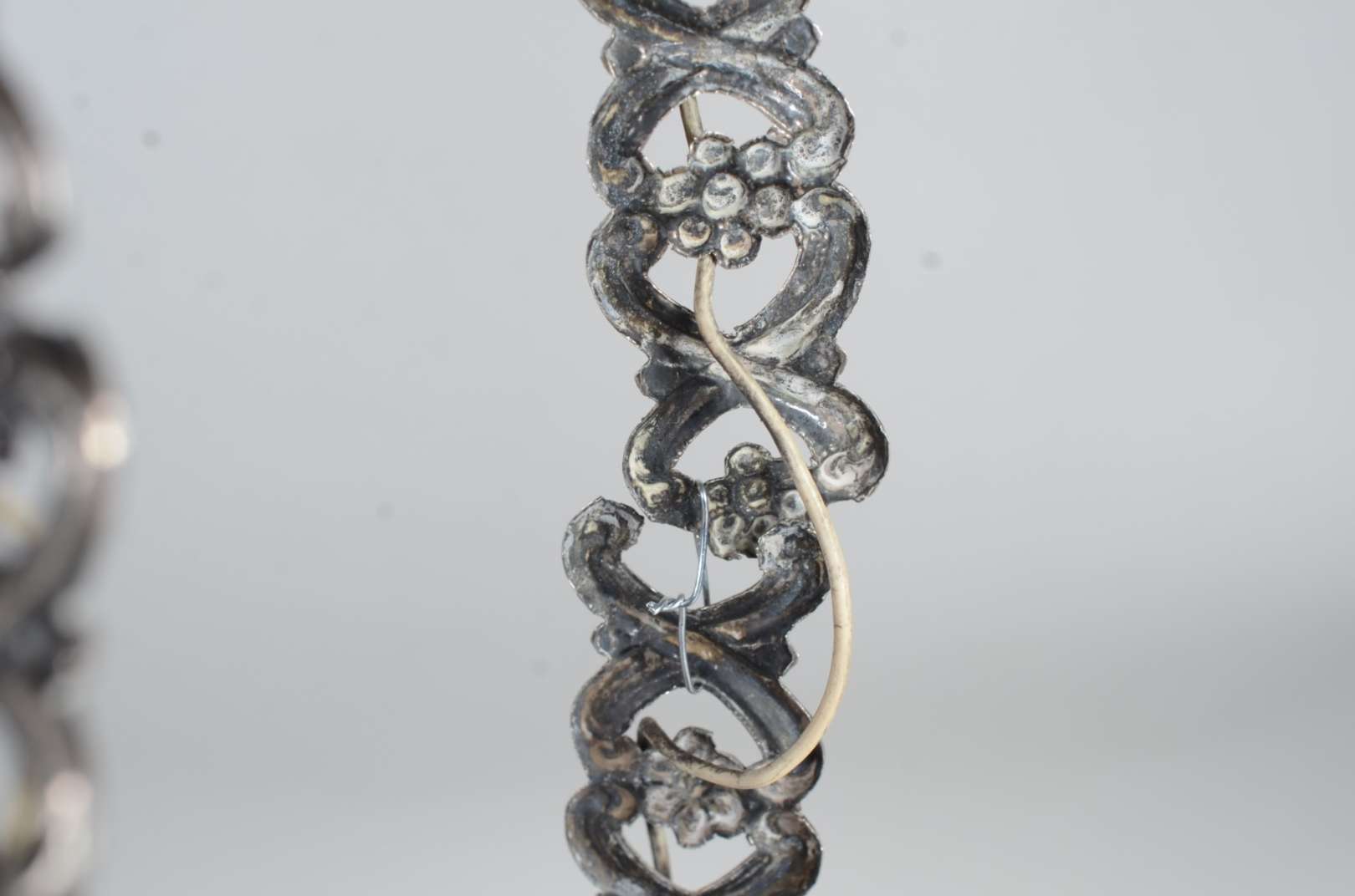 Três peças de metal, sendo: par de luminárias para 7 velas cada, decoradas com pequenos cachos de uvas e folhas de pa...