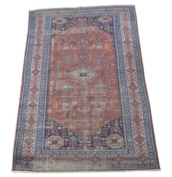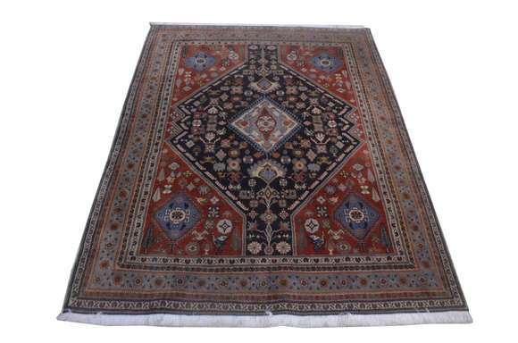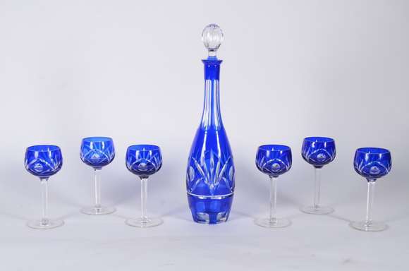 Conjunto com garrafa e seis taças para vinho de cristal doublé azul lapidado. Mínimo lascado na tampa;