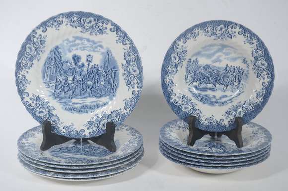Parte de serviço de porcelana inglesa "Johson Bros - Coaching Scenes", composto de: 6 pratos fundos e 6 pratos rasos....