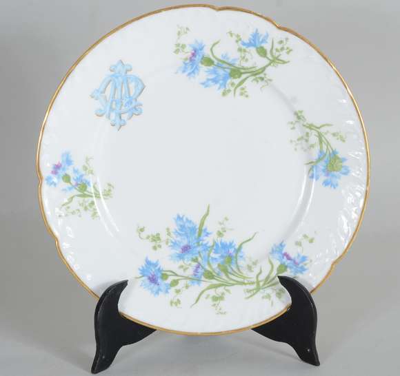 Prato de sobremesa de porcelana francesa Limoges, monogramado, decorado com flores em tons de azul e verde, borda rec...