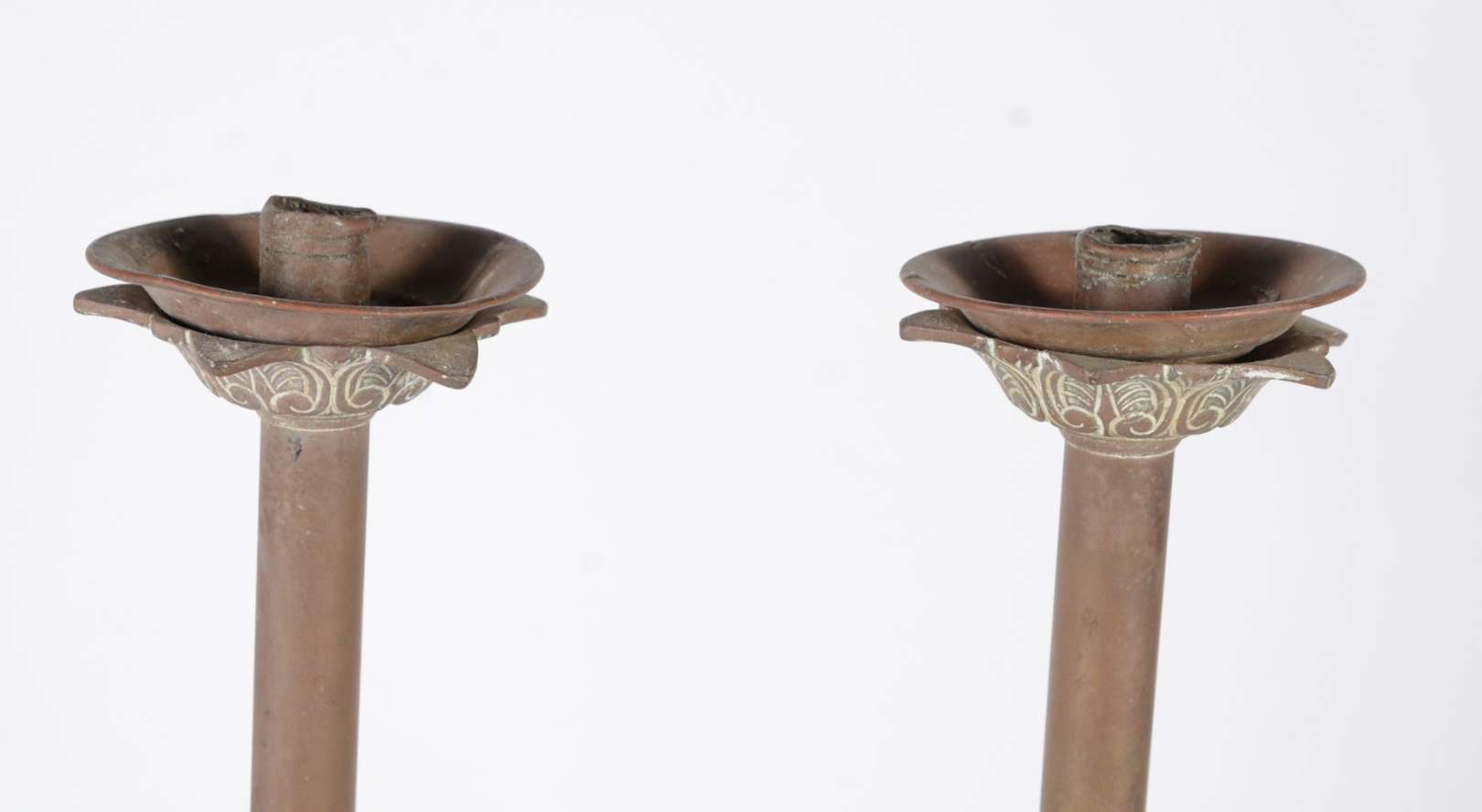 Par de castiçais de prata contrastada, acompanham as bobeches cinzeladas. Peso da prata: 970 g. (Por motivos de segu...