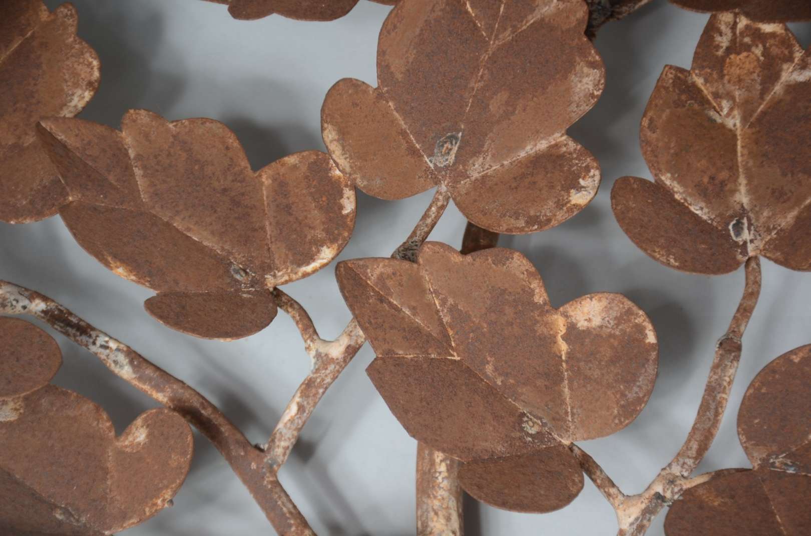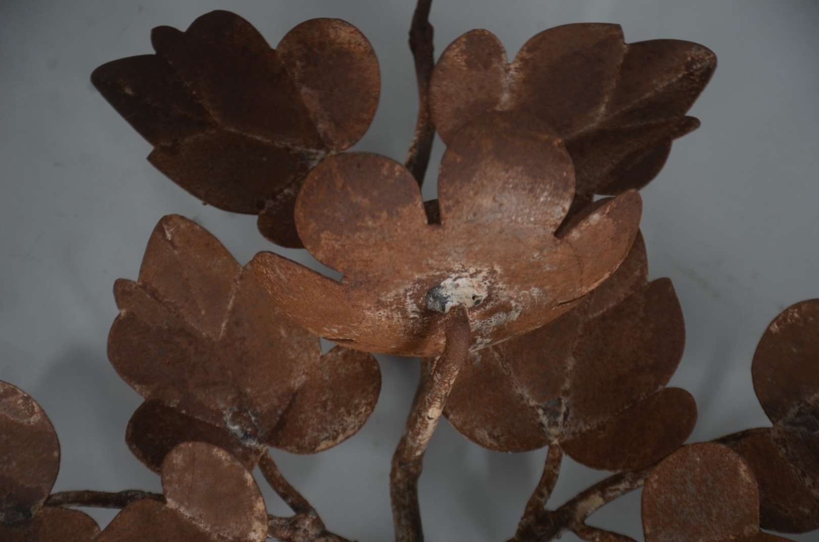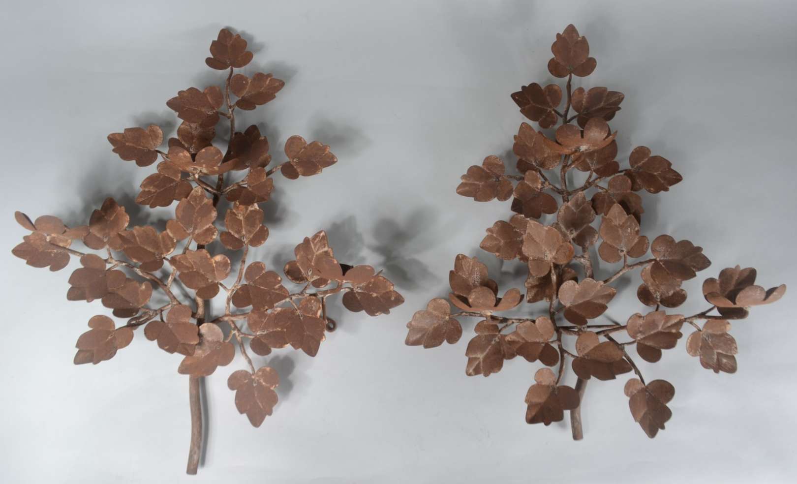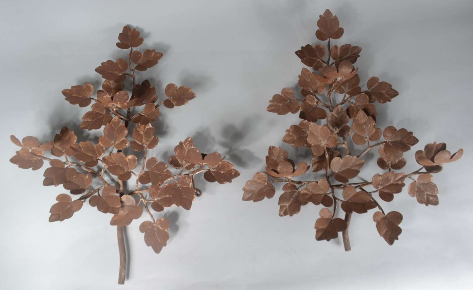 Três peças de metal, sendo: par de luminárias para 7 velas cada, decoradas com pequenos cachos de uvas e folhas de pa...