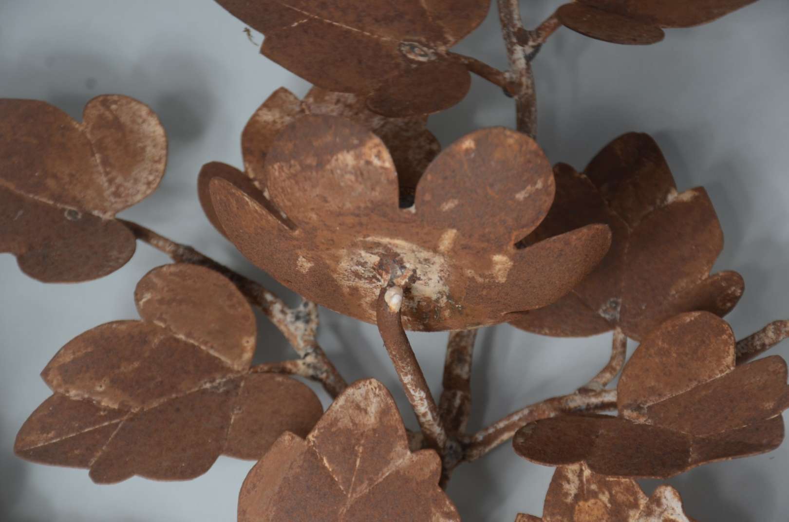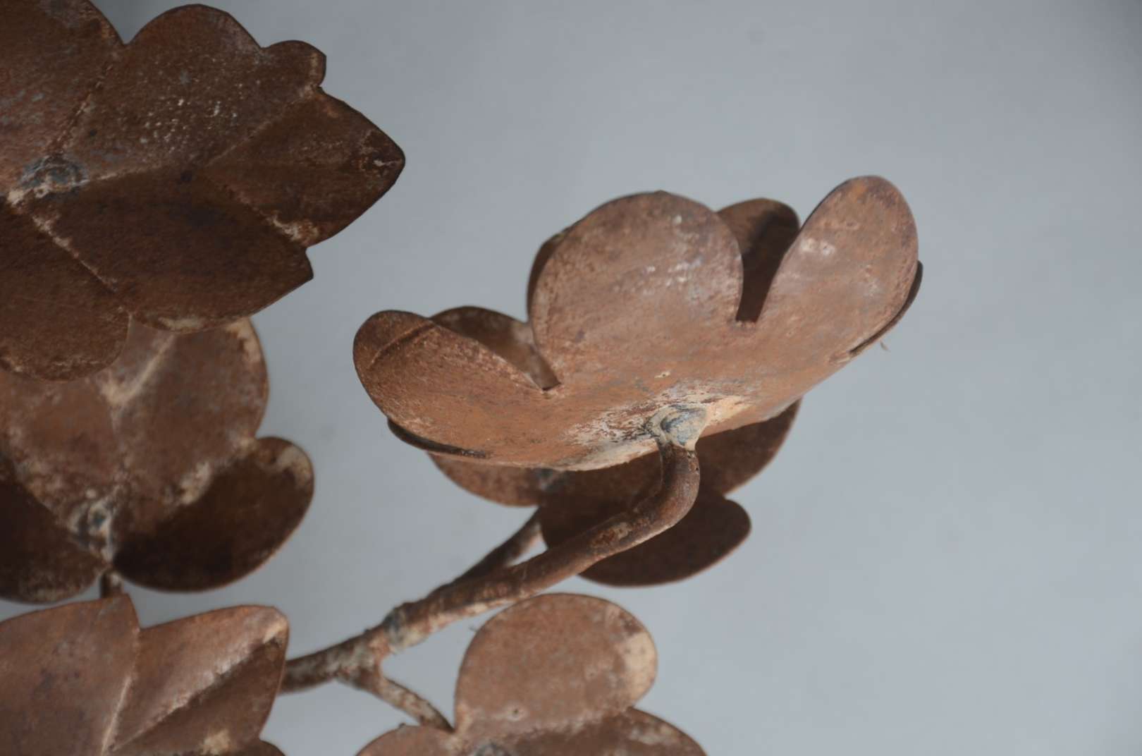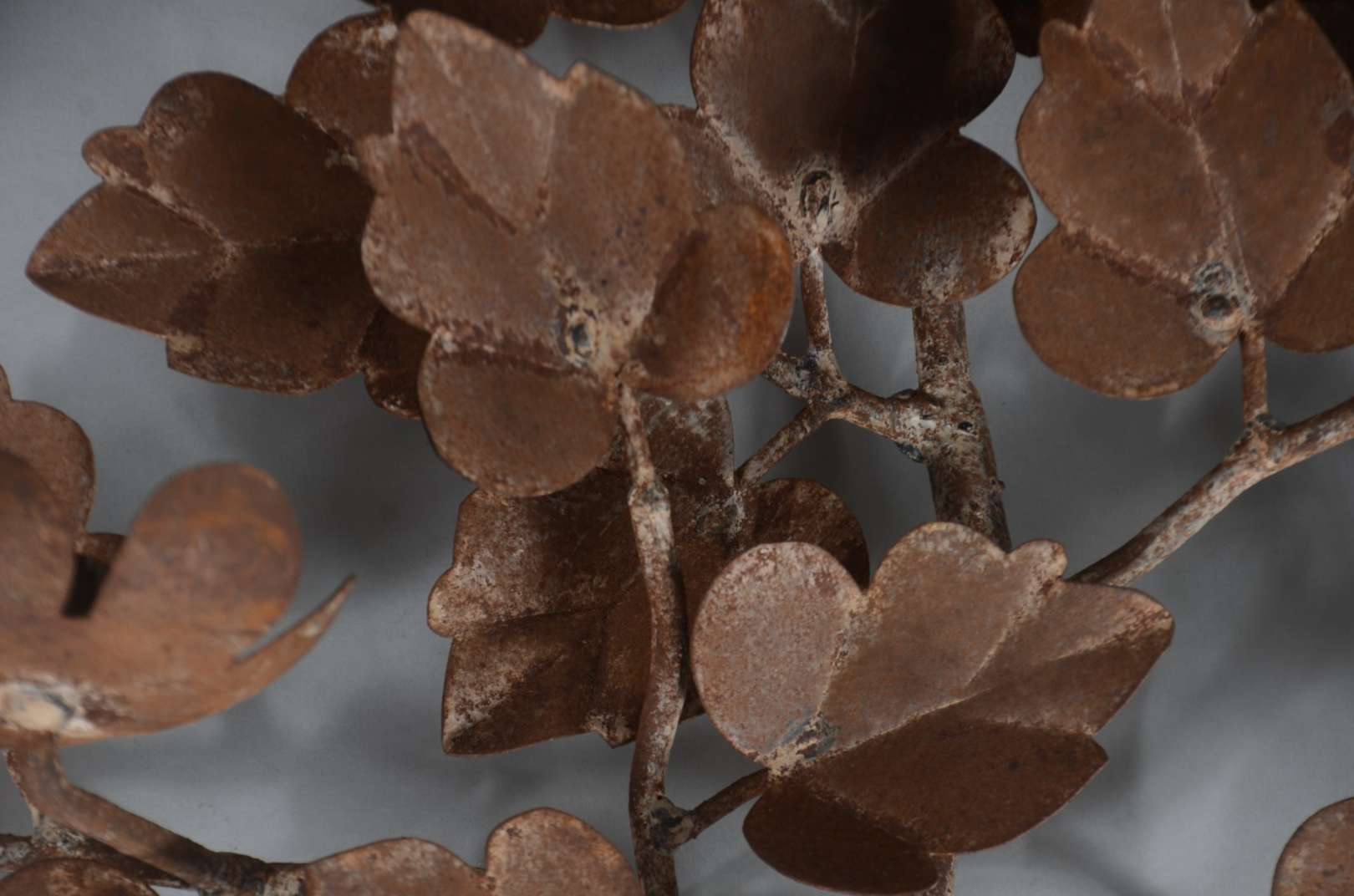 Três peças de metal, sendo: par de luminárias para 7 velas cada, decoradas com pequenos cachos de uvas e folhas de pa...