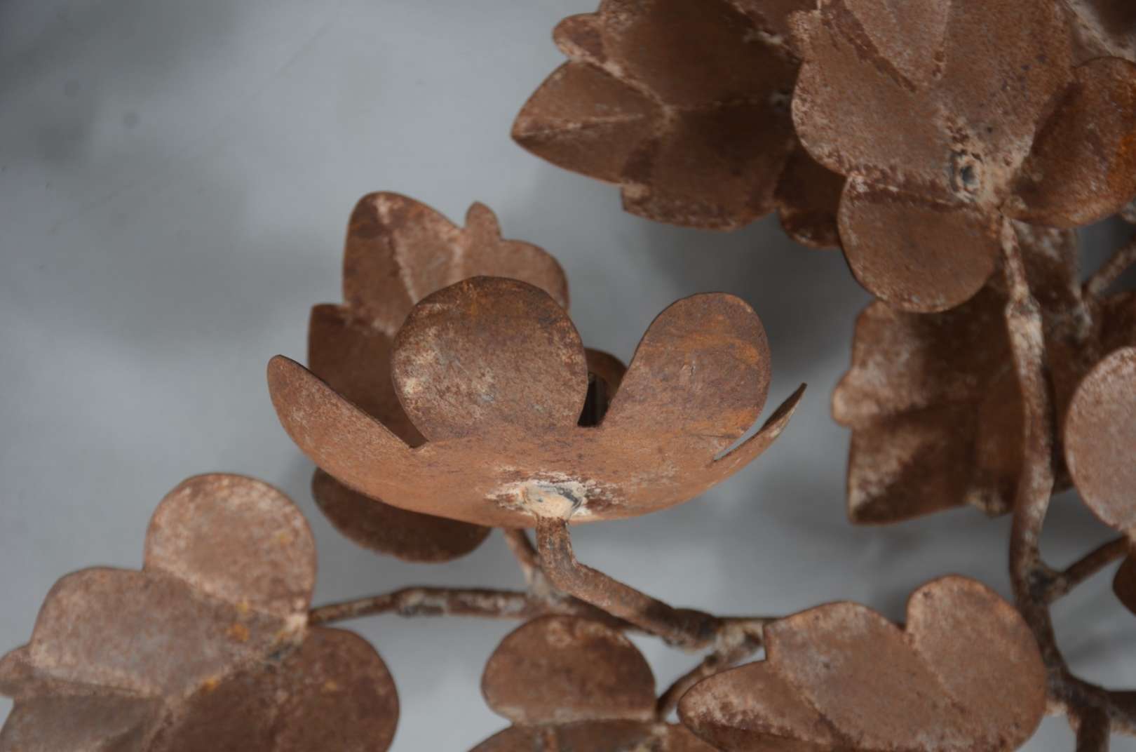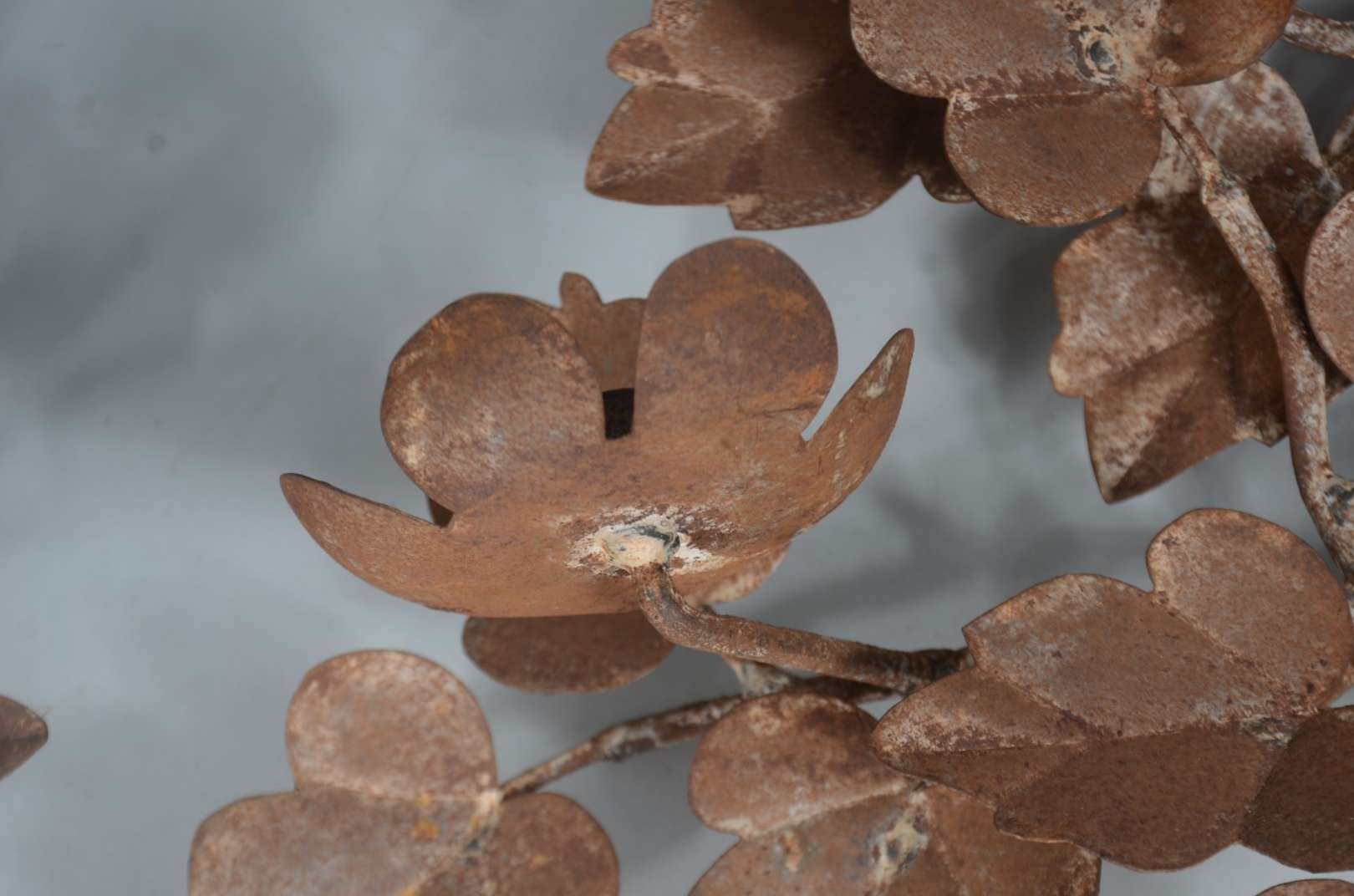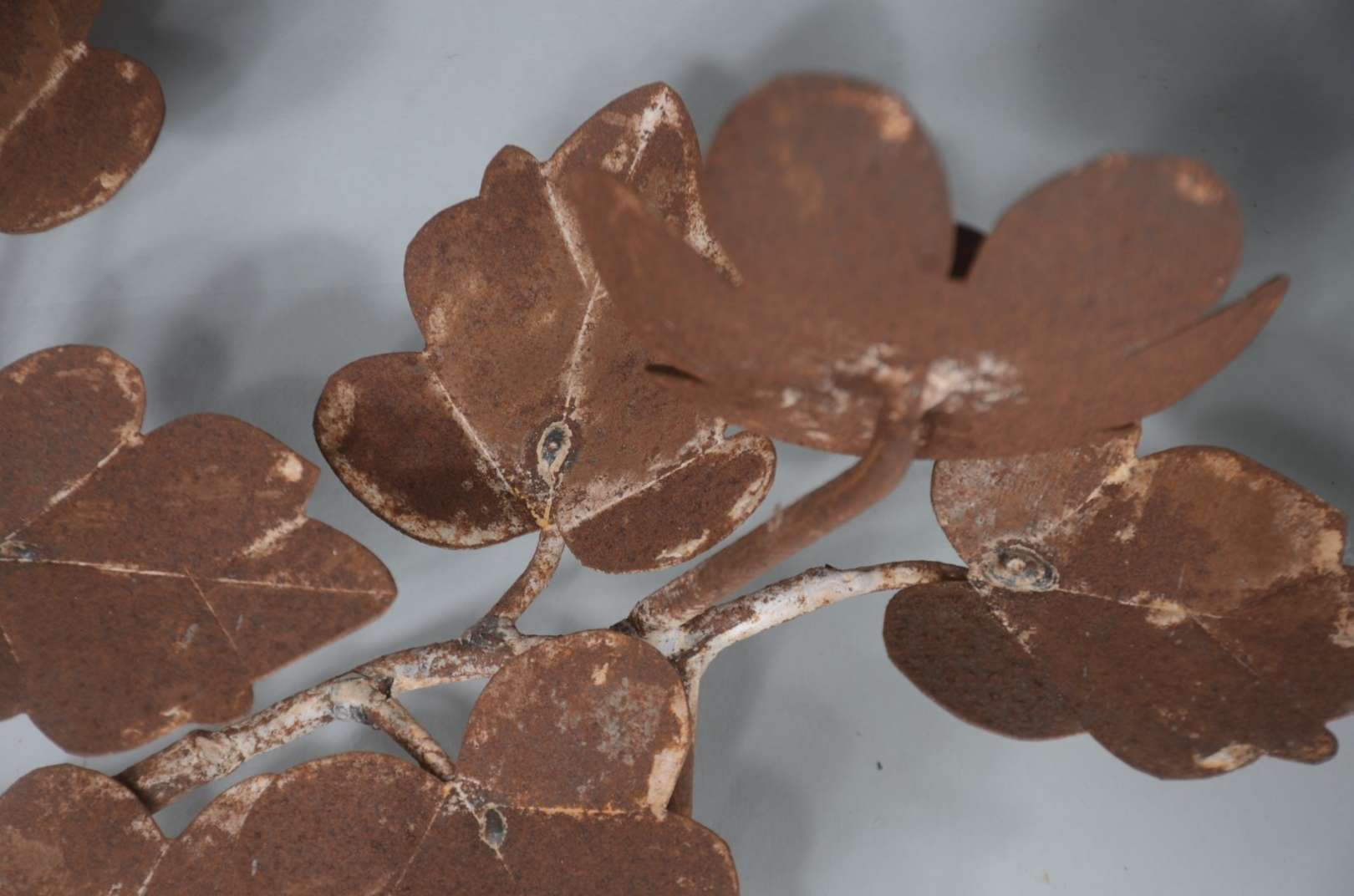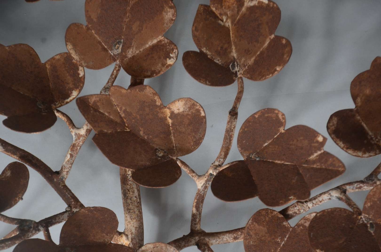 Três peças de metal, sendo: par de luminárias para 7 velas cada, decoradas com pequenos cachos de uvas e folhas de pa...