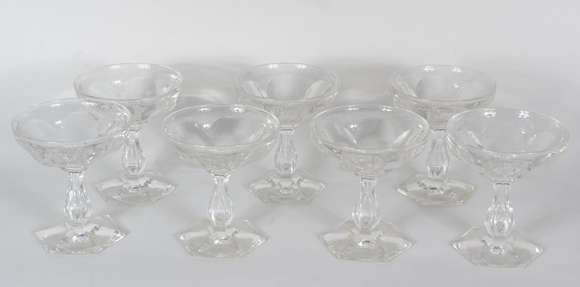 Sete taças para champagne de cristal frances facetado, bases sextavadas.