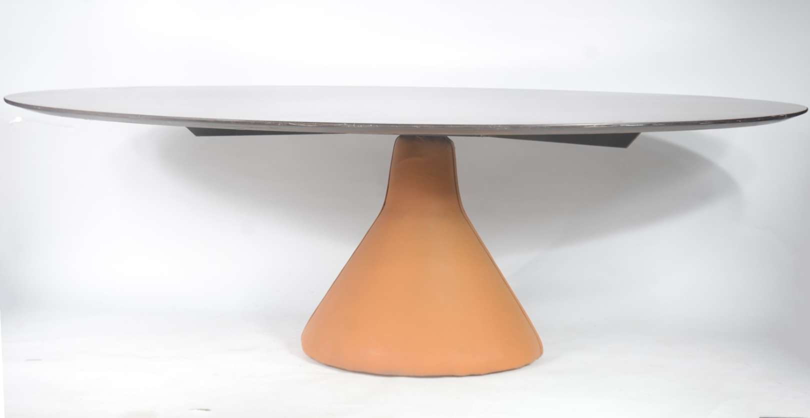 Mesa de madeira nobre, tampo retangular apoiado em base torneada.