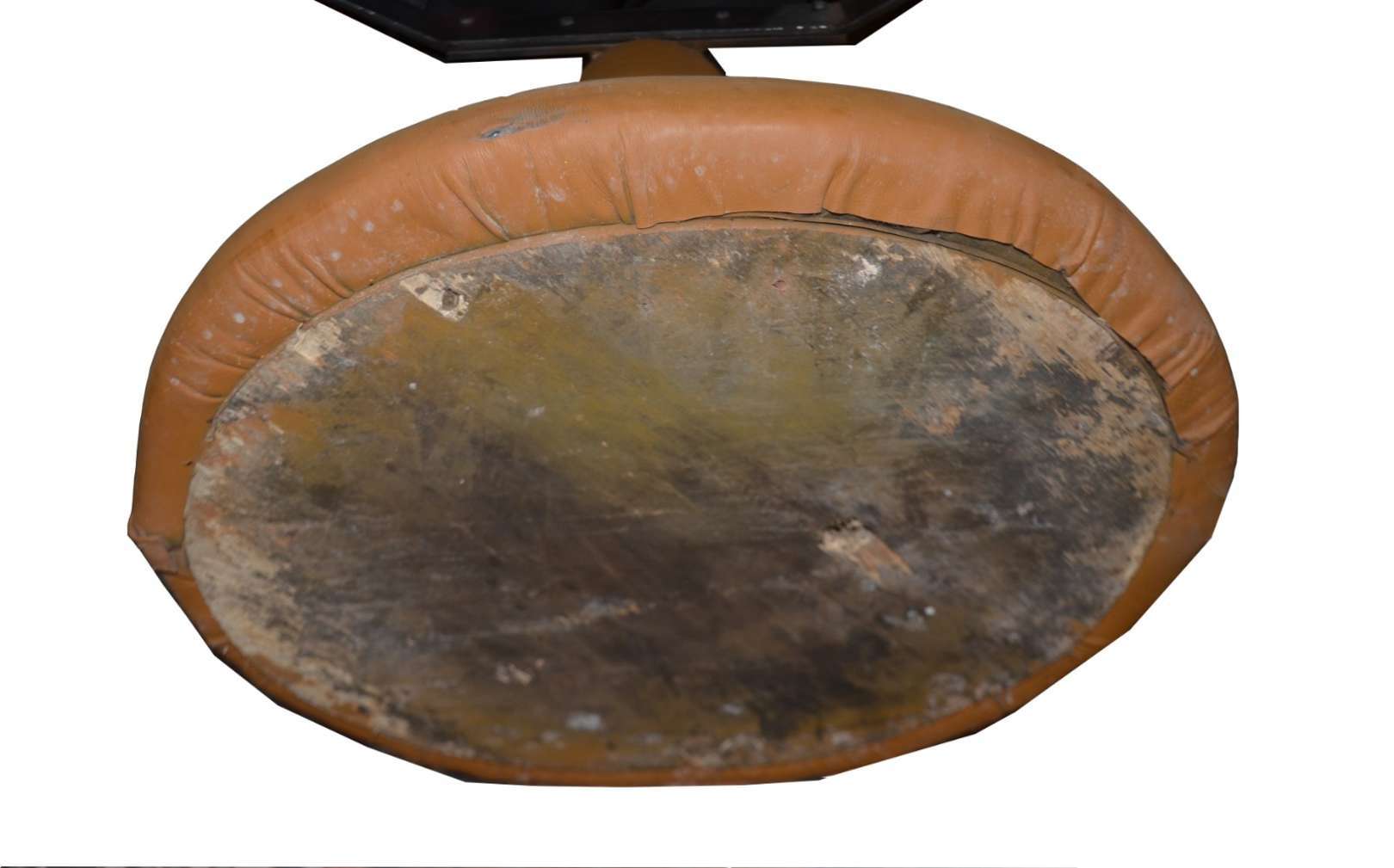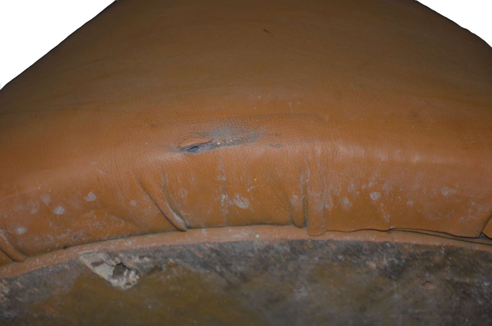 Sofá estofado e forrado em tecido na cor mostarda, dito "queixo mole". Desgastes.