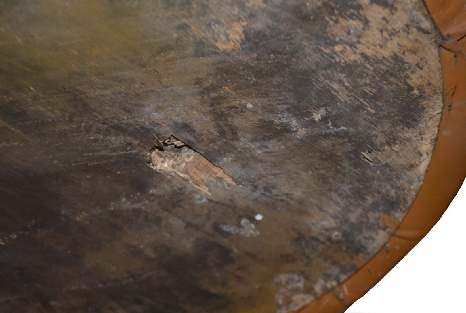 Mesa auxiliar redonda de madeira nobre, tampo apoiado em três pernas entalhadas. Descascando no folheado.