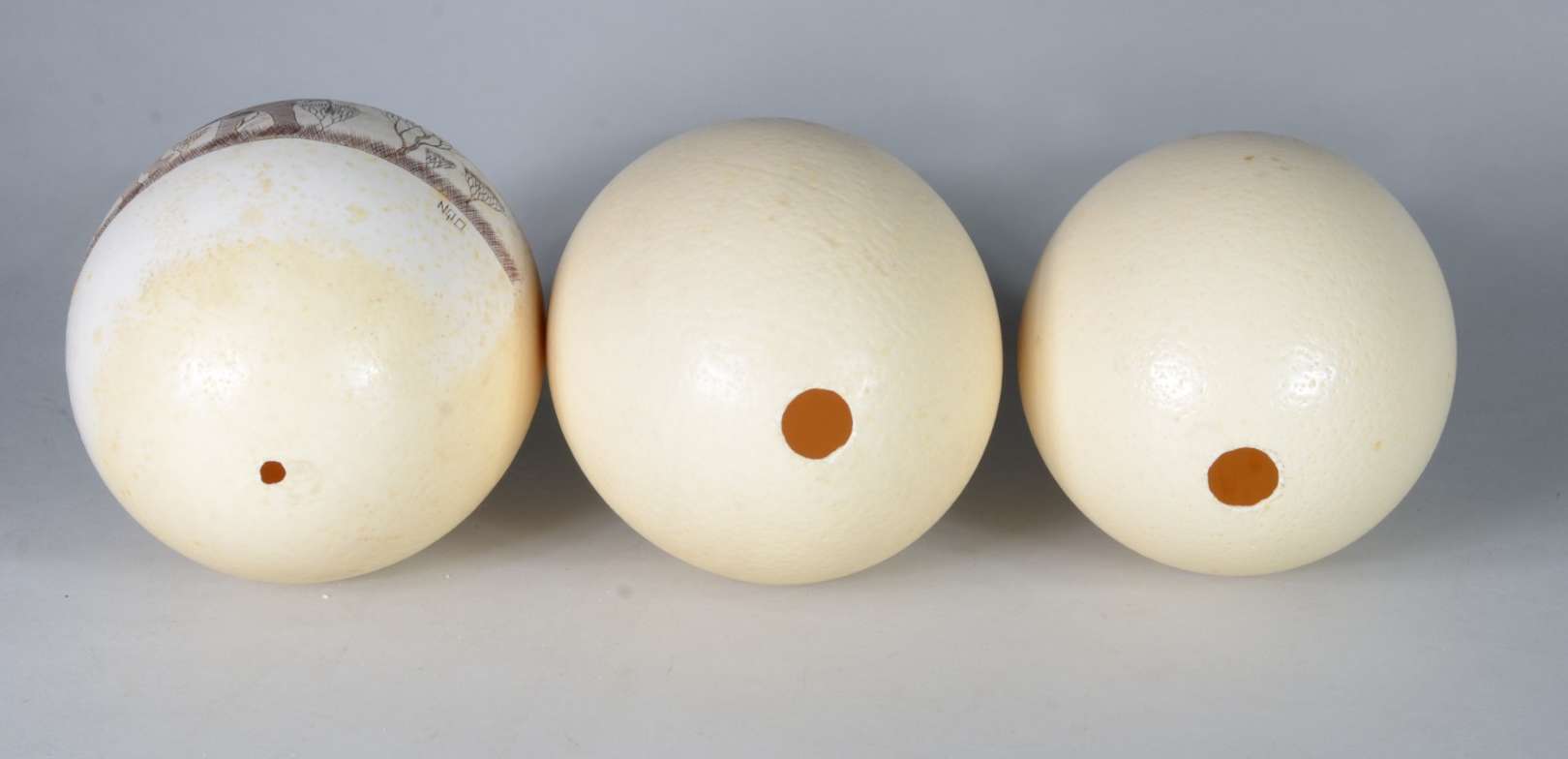 Três frutas de porcelana verde com detalhes em dourado, sendo: duas peras e uma maçã.