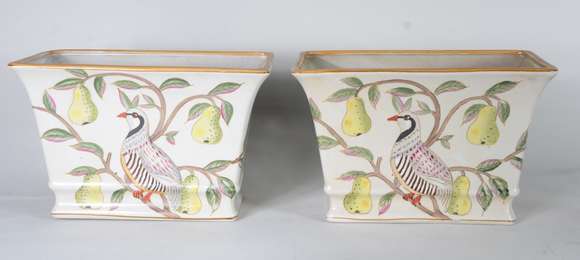 Par de floreiras de porcelana com pássaros em policromia.