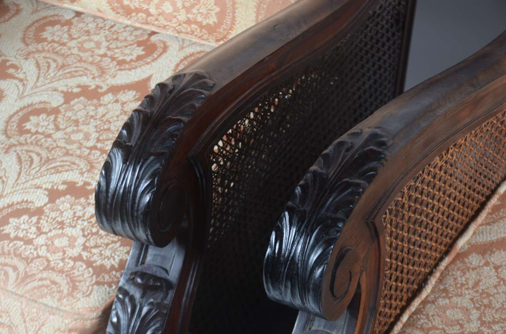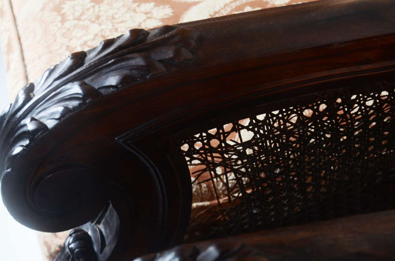 Par de cadeiras baixas de madeira nobre, estofadas e forradas em tecido adamascado com tacheados.