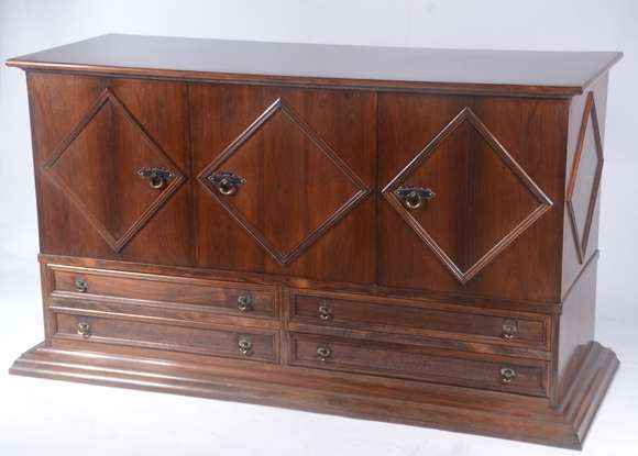 Buffet de madeira nobre com quatro gavetas externas na parte inferior, encimadas por tres portas com losangos em rele...